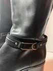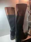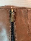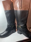 Elevate your style with these sleek Bandolino riding boots. Crafted from high-quality leather, these knee-high boots feature a colorblock design in classic brown and black, accented with a stylish zipper detail. The almond toe shape and low block heel provide a comfortable fit, while the fabric lining and insole ensure all-day comfort. Perfect for travel, casual outings, or business occasions, these boots are a versatile addition to any wardrobe. The equestrian theme and buckle accents add a touch of sophistication, making them ideal for any fashion-forward woman. Don't miss out on this must-have item for the stylish shoe collection.