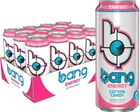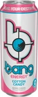 Ingredients carbonated water, natural flavors, citric acid, phosphoric acid, caffeine, sodium benzoate (preserves freshness), potassium citrate monohydrate, EAAs (L-leucine, L-isoleucine, L-valine, L-lysine, L-threonine, L-phenylanine, L-histidine, L-methionine, L-tryptophan), sucralose, potassium phosphate dibasic, vitamin C (ascorbic acid), potassium sorbate (preserves freshness), magnesium chloride, calcium chloride, calcium disodium EDTA, vitamin B3 (niacinamide), vitamin B6 (pyridoxine hydrochloride), and vitamin B12 (mthylcobalamin). About this item Brand BANG Item Form Liquid Flavor Cotton Candy Number of Items 12 Package Information Can 300 MG OF CAFFEINE: Bang Energy drinks contain enough caffeine to power you through any activity of the day. Stay energized for longer without the dreaded crash. ZERO-SUGAR ENERGY DRINK: NO sugar necessary Just great-tasting, sustained energy. ULTRA CoQ10 and EAAs (Essential Amino Acids) GLUTEN-FREE AND VEGAN-FRIENDLY: Bang Energy drinks are gluten-free and vegan-friendly, so they are perfect for any lifestyle or diet. ZERO CARBS, ZERO ARTIFICIAL COLORS and ZERO CALORIES. Product Description Only the reformulated Bang Energy drinks have been tested and verified to be gluten-free and vegan-friendly. If you receive cans that have “BCAA Aminos” instead of “EAA Aminos” printed on them, we cannot guarantee that they fall within the gluten-free and vegan-friendly guidelines. Bang is not your typical sugar-filled soda masquerading as an energy drink. Every 16-ounce can of Bang contains 300 milligrams of caffeine, which studies have shown may increase endurance, as well as strength in some cases, along with essential amino acids (EAA Aminos), CoQ10.< What’s more, Bang is sugar-free and has ZERO calories — yet it tastes great, with 21 different flavors to choose from and counting!