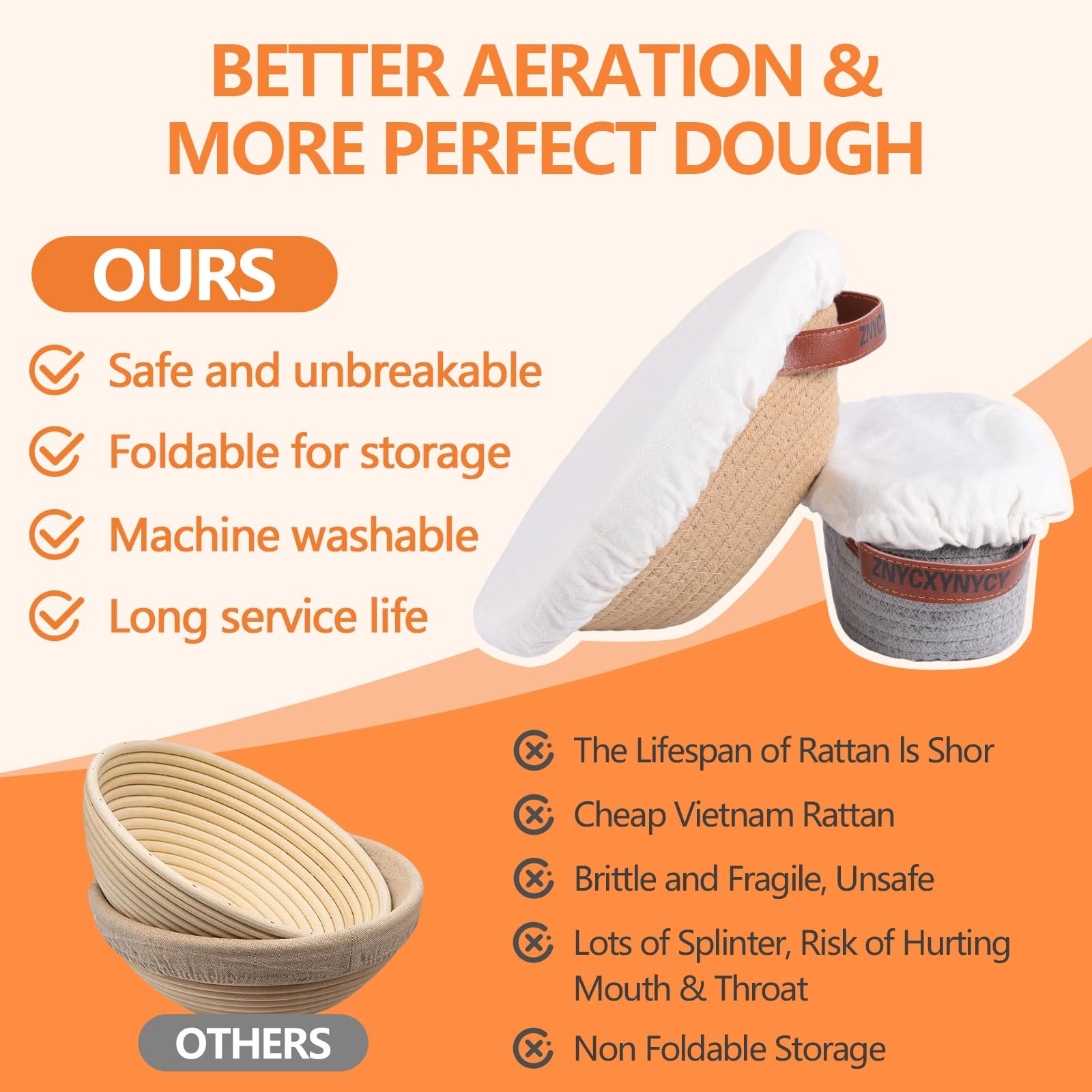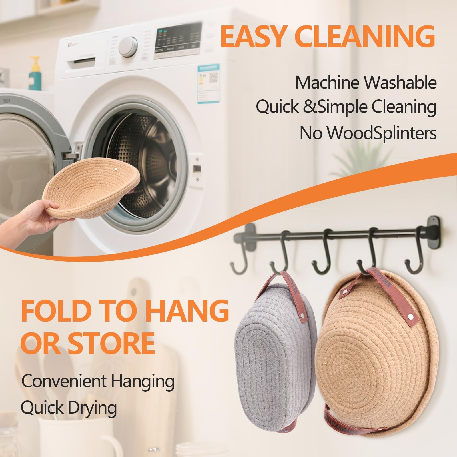 Bread proofing baskets for sourdough– 2 Pcs Artisan Sourdough Baking Essentials with Liners & Covers Elevate your homemade bread with our sourdough baskets banneton – the ultimate tool for achieving professional-quality sourdough loaves. This set includes 1 round(10.5 inchs) + 1 oval basket (11 inchs), complete with organic flour-resistant liners and breathable linen covers, designed to simplify your fermentation process while adding rustic artisanal charm. Why Bakers Love This Set: ✅ Natural Fermentation Control natural cotton fibers absorb excess moisture, creating the ideal humidity for slow-proofing sourdough. Say goodbye to sticky dough and misshapen loaves ✅ Dual Shape Versatility Craft crusty baguettes in the oval banneton or classic boules in the round basket – perfect for experimenting with European-style bread recipes. ✅ Easy Maintenance Guarantee This banneton bread proofing basket oval removable liners prevent flour buildup; simply tap out residue and air-dry.lifetime durability. Included in Your Set: 2x Cotton Banneton Baskets (Round + Oval) 2x Linen Dust Liners 2x Linen Dust Covers This bread banneton proofing basket perfect for: Beginners mastering sourdough hydration Bakers seeking San Francisco-style open crumb 【Breathable Fresh Keeping Design】: These oval banneton basket are made of high quality cotton that natural cotton fibers absorb excess moisture, creating the ideal humidity for slow-sourdough basket, helping to maintain a fresh environment for perfect bread-proof results. 【Easy To Clean & Store】: This proofing sourdough kit includes 2 Pcs baskets, liners and cover cloths that are machine washable. The collapsible design and included hook allows for easy drying and saves space in any kitchen 【Easy Maintenance】:This bread basket proofing removable liners prevent flour buildup; simply tap out residue and air-dry. 【Unique Design & Multi Purpose】: These banneton bread proofing basket set Not Only Ensure Perfect Rising Of The Dough, But Also Serve As Beautiful sourdough bread basket, Making It Easy for you To Present Your Homemade Artisan Bread Elegantly And Attractively On The Table 【Gifts】: This bread proofing baskets is Ideal for artisan bakers. Adds a touch of quality and functionality to any baking routine. An excellent gift choice for birthdays, holidays, or special occasions
