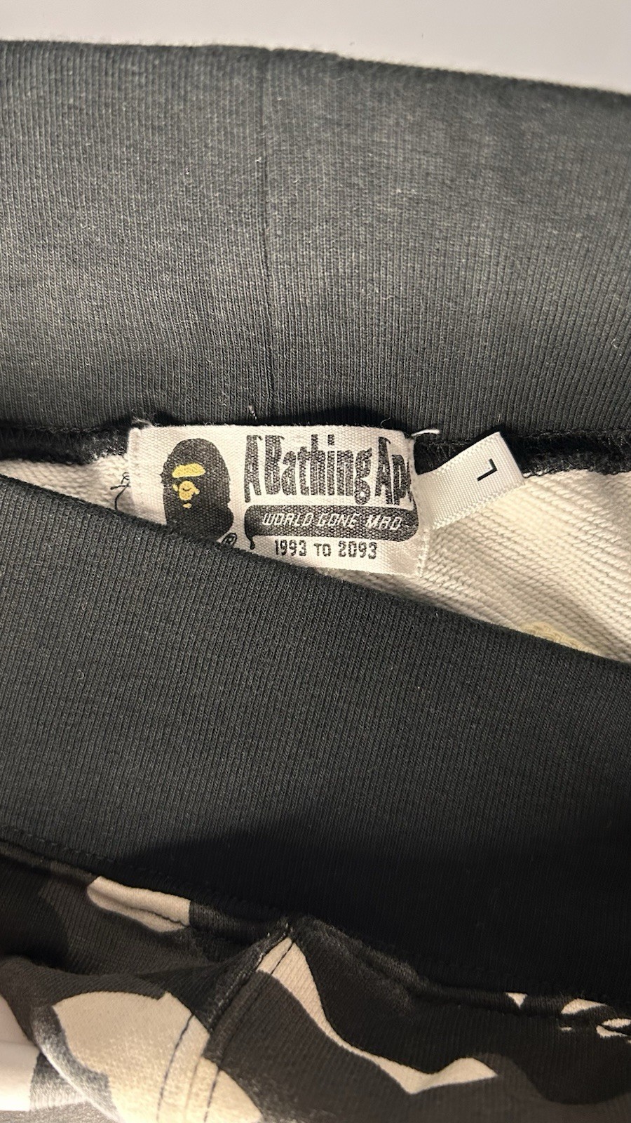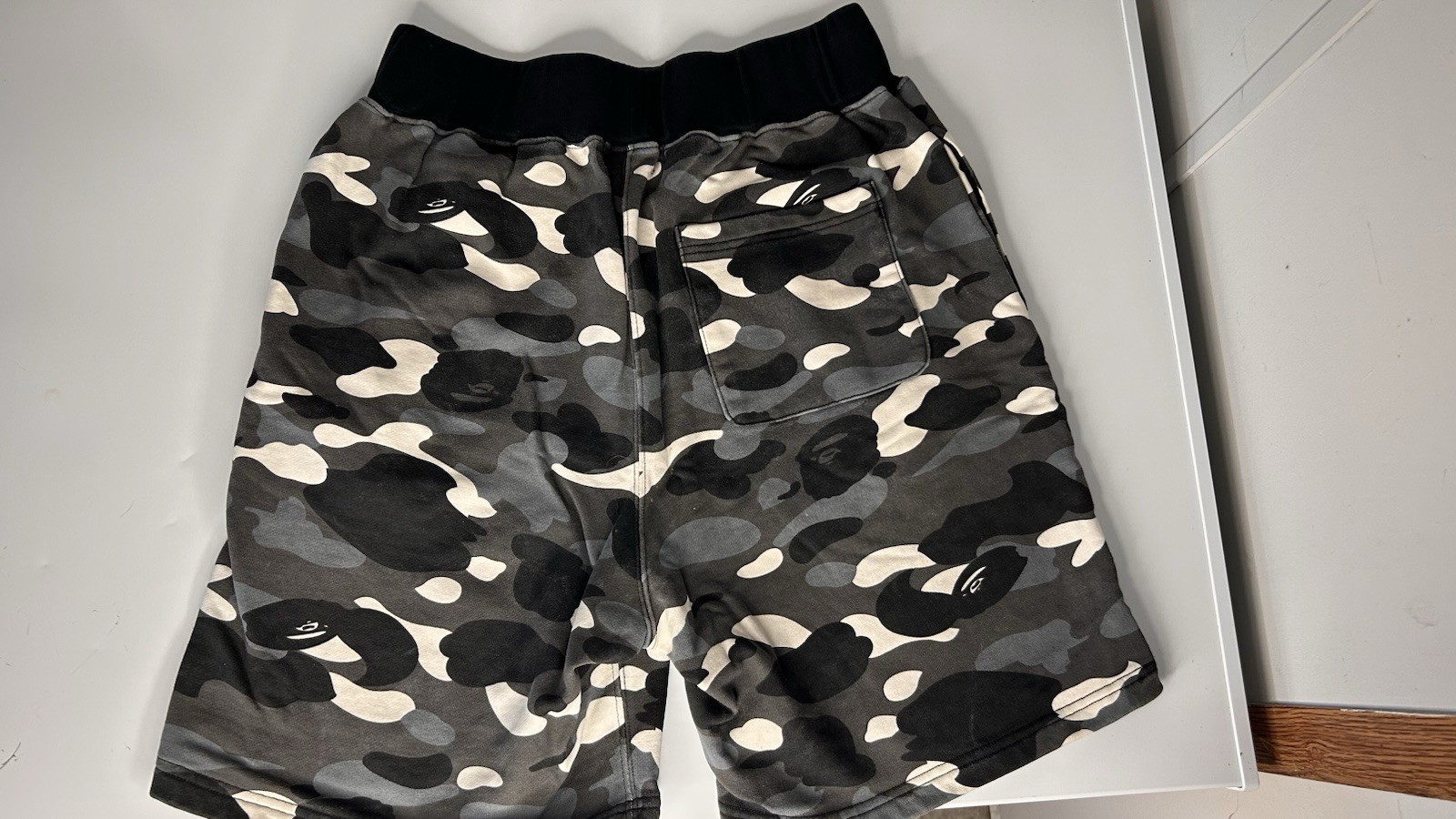 The Bape Men's Camo Shark Grey Camo Shorts in size Large are 100% authentic and made from cotton. These casual shorts feature a camouflage pattern, drawstring closure, and pockets for added style and functionality. The mid-rise fit and flat front design make them comfortable and versatile for summer wear. Perfect for a casual and laid-back look, these shorts are a must-have addition to any man's wardrobe.