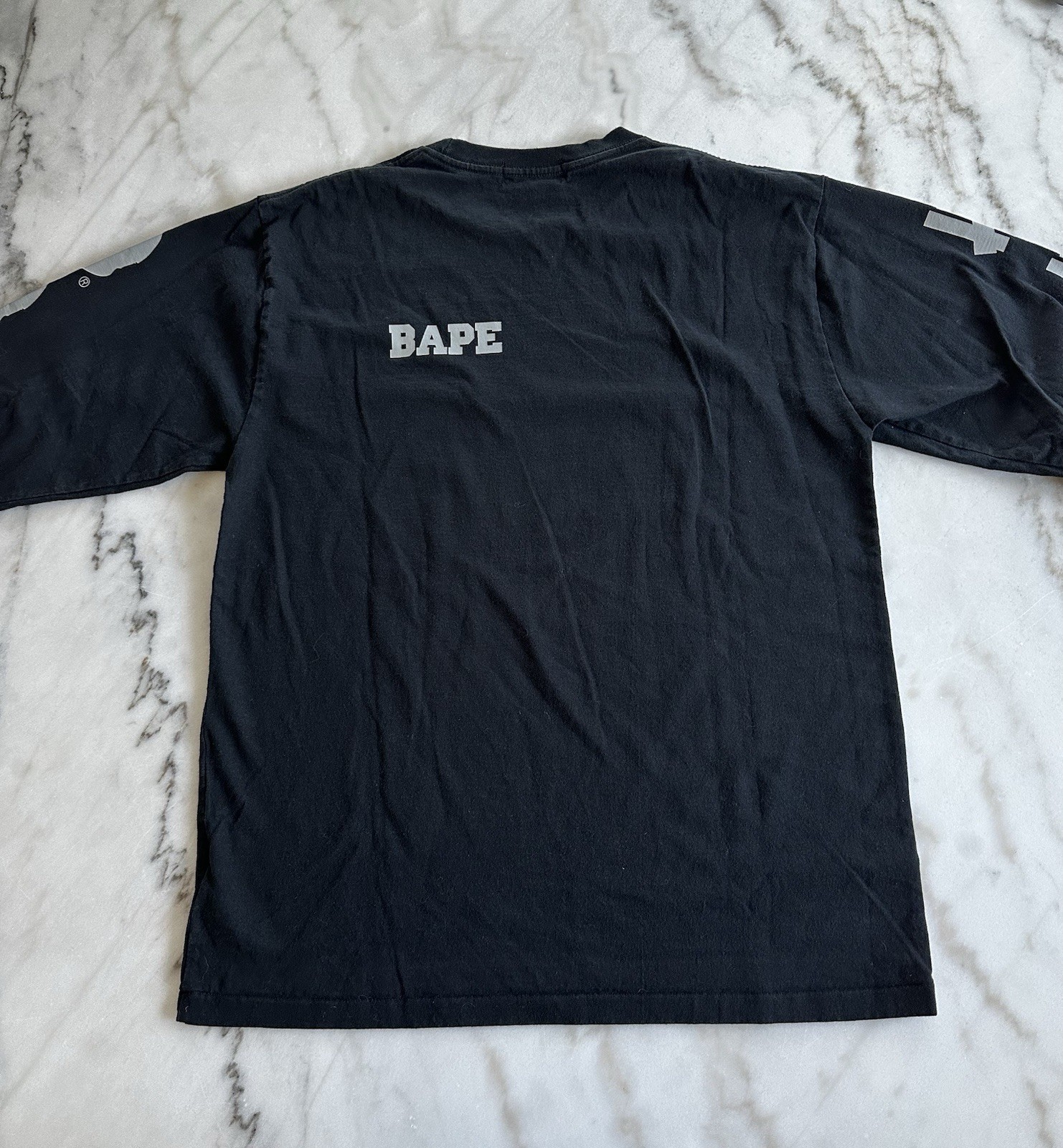 The Bape X Undefeated Black/Grey Long Sleeve T-Shirt XL is a stylish and comfortable garment made of cotton. It features a classic crew neck and regular fit, perfect for everyday wear. With its black color and bold branding from A Bathing Ape and Undefeated, this shirt is a fashionable choice for men's wardrobe. Machine washable for easy care, this shirt is a versatile addition to any collection.