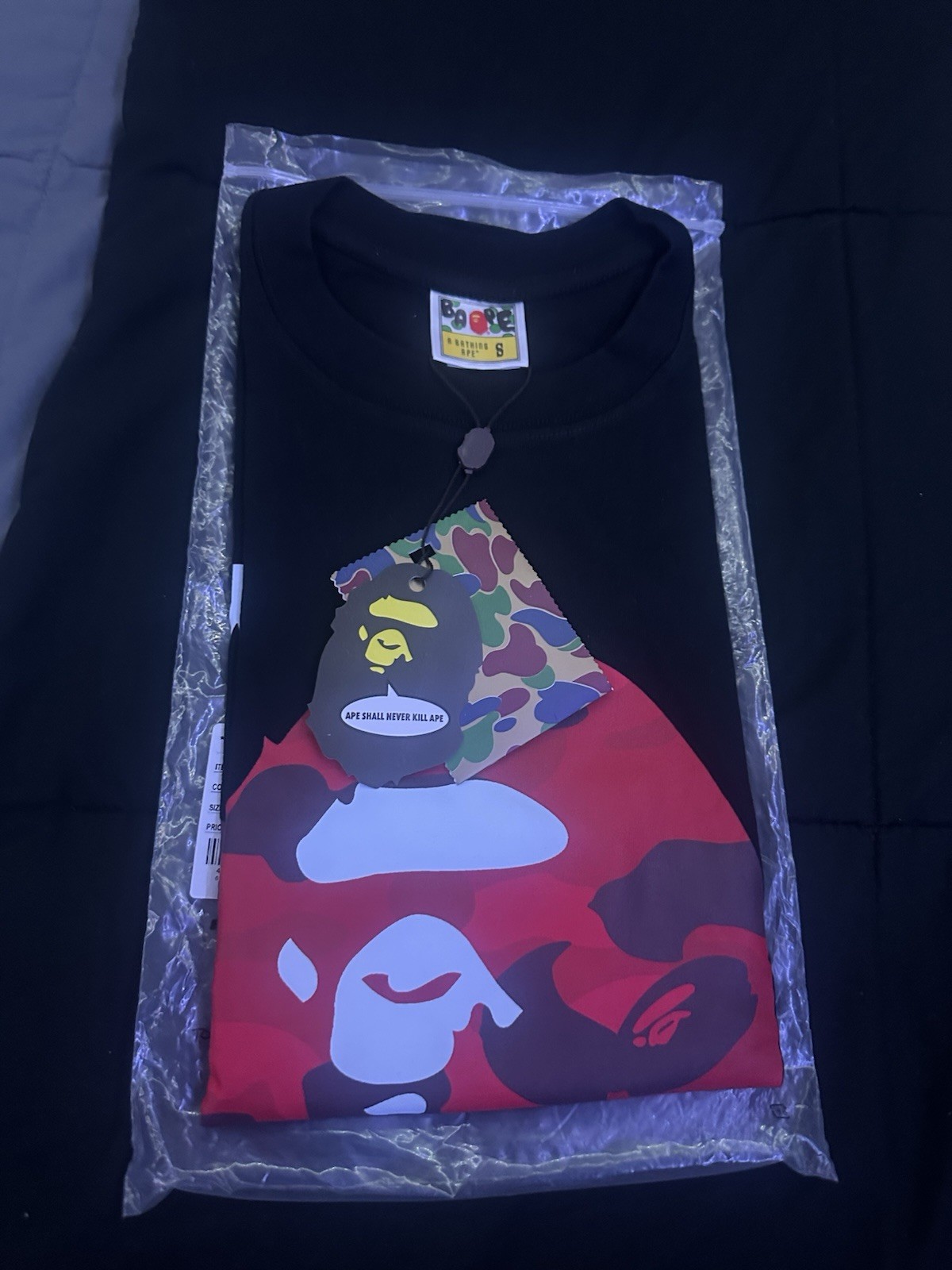 The Bape shirt is a brand new size small black t-shirt with short sleeves and a crew neck. Made of cotton, this designer piece features the iconic A Bathing Ape logo as accents. Manufactured in Japan in the 2020s, this regular fit shirt is perfect for the summer season. Machine washable and not vintage, this t-shirt is a stylish addition to any man's wardrobe.