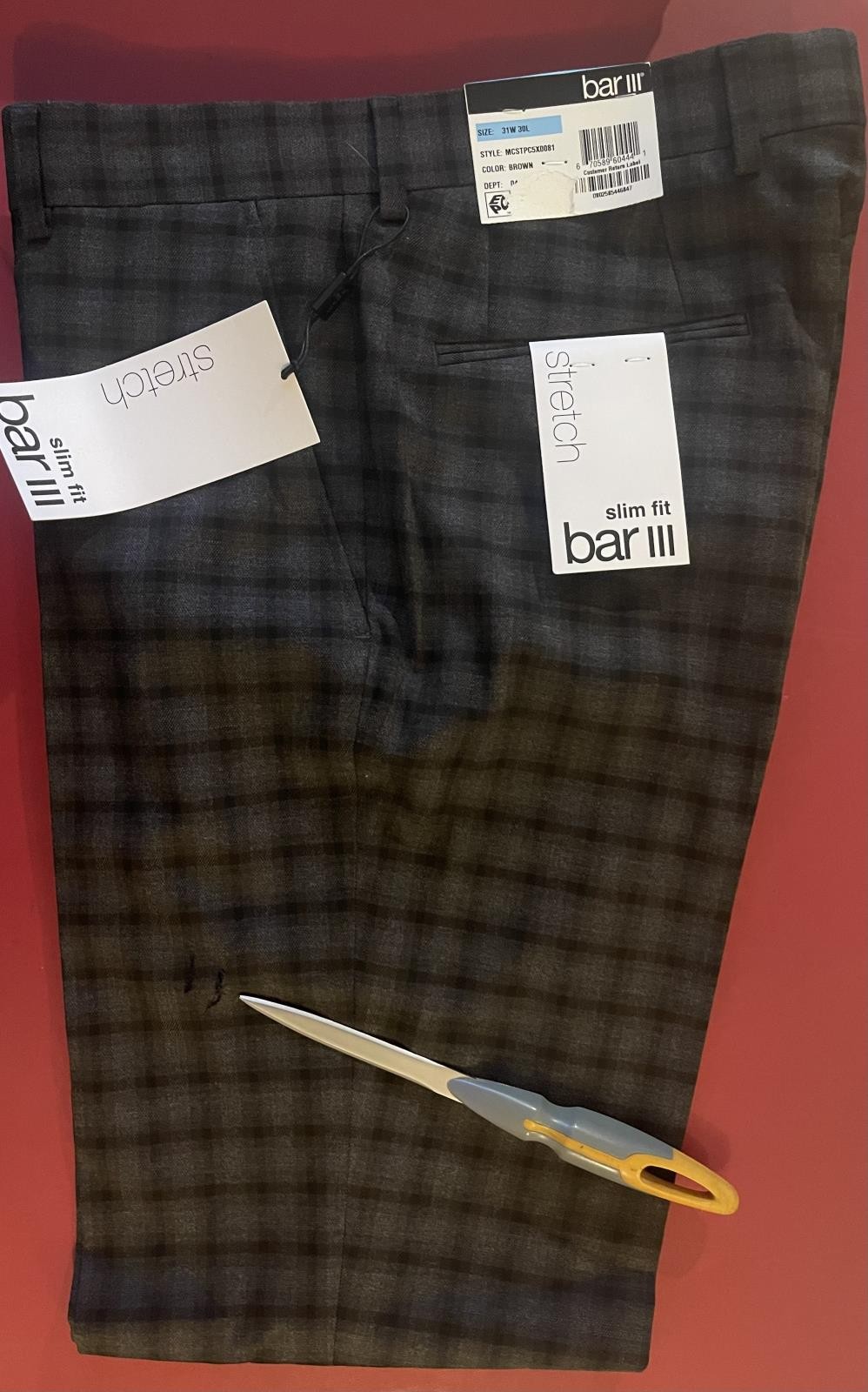 ebay template Bar III Men's Slim Brown Check Pants 31 X 30 New MCSTPC5X0081 IMPERFECT Description BAR III MEN'S BLUE SLIM FIT STRETCH WRINKLE-RESISTANT DRESS PANTS 31 New $175 ZA8-6 General Info Retail Price: $175 Brand: BAR III Condition: New 2 Tears please check last pics US Size: 31 Made In: Vietnam Fabric Color: Brown/Gray Pattern: Check Fabric: Polyester Blend Fabric weight: Light. Measurements & Style Pant Waist: 32" Additional Fabric To Expand Waist: 2.5" Rise: 10.25" Inseam: 29.5" Width At Knee: 17" Width At Cuff: 15" Fly: Zipper Lining: Lined to the knee Front Style: Flat ix6750 About Us Payment Shipping Return Consign With Us FAQ About Us The Consignment Spot is a family owned and operated online fashion retailer for hundreds of customers worldwide with over 14 years of experience. Dimitrios started his business because the power of hunting for luxury goods at reasonable prices became an obsession. His family and friends would always count on him to resell their prized possessions, and knew he would get top dollar for all their items. His passion for selling and negotiating luxury goods evolved into a highly successful eBay seller, known as Theconsignmentspot, which then lead to theconsignmentspot.com. By expanding his selling platforms he has developed many international relationships in order to bring over designer clothes for reasonable prices. Our friendly family approach is what sets up apart from all other consignment competitors. Payment We accept payment via ebay ONLY and payment is required within 4 days. Shipping We ship within 1 business day. Combined shipping is discounted for each additional item purchased within 4 days of the original item. Please wait for us to send you a combined invoice. We do offer an international combined shipping discount as well based on weight. Returns We offer the best return policy in the industry! If you are not completely satisfied with your purchase, return your item within 14 days for a full refund. Shipping not included. Consign With Us Consign With Us Our Open-Auction ebay platform has allowed us to focus on Consignment, and meet clients that are looking to make a profit from their personal High-End Collections. theconsignmentspot.com offers that personal one-on-one service with all our clients in order to get the most bang for your buck on all your luxury goods. We have personal one-on-one conversations with you to explain the consignment process, and set up pricing details with your approval. Contact us today to request a Consignment Kit. FAQs All items are absolutely authentic with no exceptions! These are premier luxury goods from the world's top designers and tailoring houses, straight from Paris, Milan, London and New York to your front door! TheConsignmentSpot.com Sell Smarter with Kyozou. Inventory and Ecommerce Management