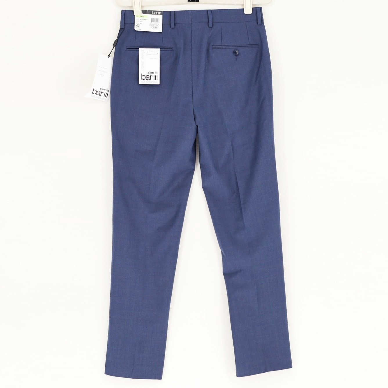 Bar III Men's Solid Blue Wool Blend Slim-Fit Suit Dress Pants Size 30W 30L New with tags MSRP $175 Zip fly with button closure Belt loops Flat front Finished hem, no cuff Permanent crease Lined Two side slant pockets Two back button-through welt pockets 55% wool / 41% polyester / 4% elastane Lining: 100% polyester Dry clean