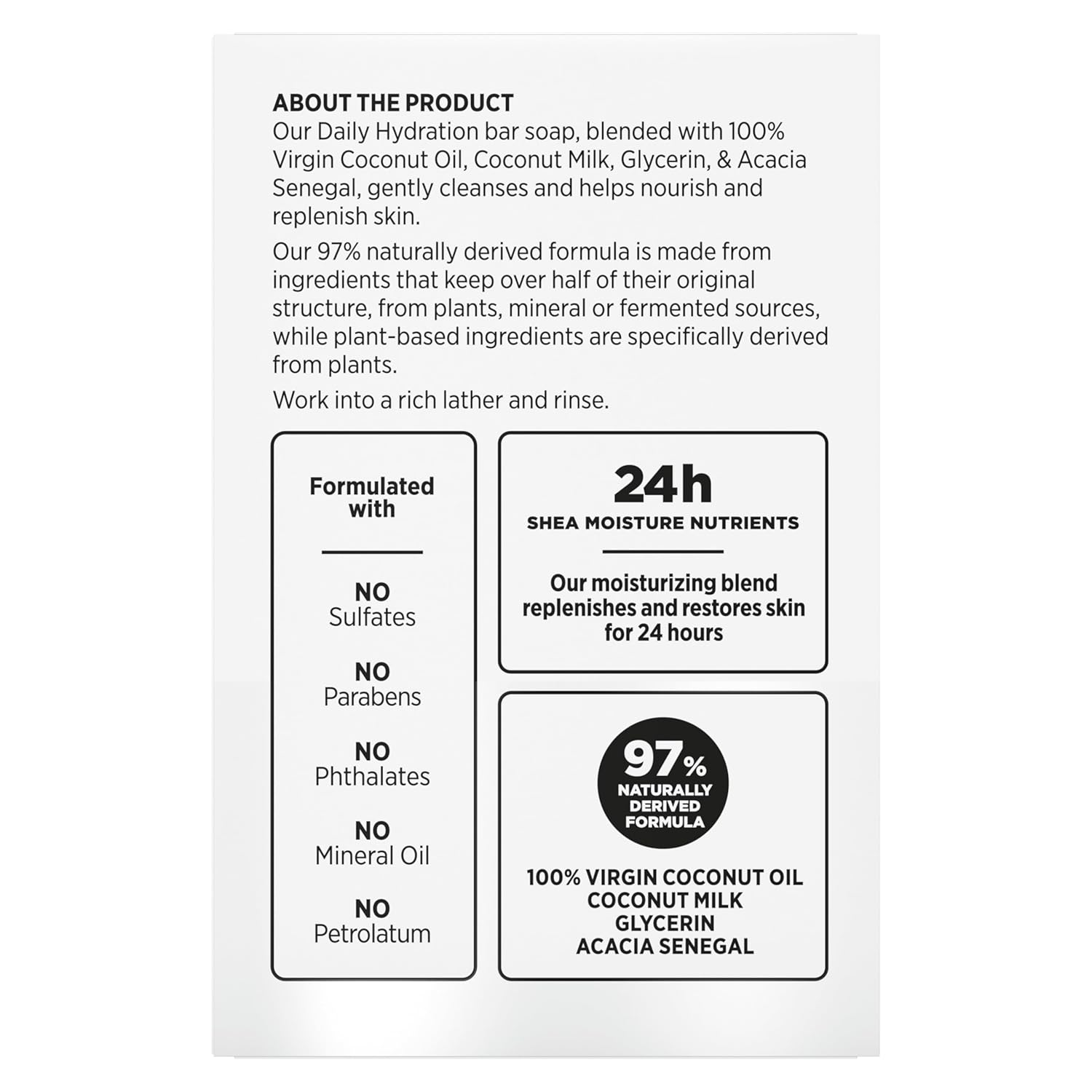 Store New Arrivals Add to Favorite View Feedback Contact Bar Soap Virgin Coconut Oil 4 Count Nourish and Replenish Skin Daily Hydrating Bar Soap with 24H Shea Moisture Nutrients for Healthy, Glowing Skin 8 Oz Description Item dimensions L x W x H 8.62 x 12.75 x 2.5 inches Product Dimensions 8.62 x 12.75 x 2.5 inches; 2 Pounds Country of Origin USA Item Weight 32 Ounces Age Range (Description) Adult Scent Coconut SheaMoisture's 100% Virgin Coconut Oil Daily Hydration Bar soap, designed for melanin-rich skin, replenishes and restores skin for 24 hours. Infused with 100% Virgin Coconut Oil, Coconut Milk, Glycerin & Acacia Senegal, this bar soap gently cleanses and helps nourish and replenish skin. Made with fair trade shea butter and 92% naturally derived ingredients, this bar soap is free from sulfates, parabens, phthalates, mineral oil, and petrolatum. Upon use, skin feels calm, smooth, and visibly moisturized. For best results, use in combination with other products from SheaMoisture's 100% Virgin Coconut Oil Collection. SheaMoisture is committed to serving the Black community through strategic investment and community give back. With every purchase, you're helping to fund investments that support Black-owned businesses. Our new 100% Virgin Coconut Oil Daily Hydration Bar soap is designed specifically for melanin-rich skin. Infused with 100% Virgin Coconut Oil, Coconut Milk, Glycerin & Acacia Senegal, this bar soap works to nourish and replenish skin, leaving it feeling soft, smooth, and visibly moisturized for 24 hours. Our moisturizing Bar soap is formulated with fair trade Shea Butter. Through our proprietary Shea Emulsion technology, we were able to break down Shea Butter into thousands of droplets that provide even, smooth coverage across the skin. This bar soap is 92% naturally derived and free from sulfates, parabens, phthalates, mineral oil, and petrolatum. For best results, use this bar soap in combination with other products from SheaMoisture's 100% Virgin Coconut Oil Collection. ABOUT US We offer the best prices around on high quality products. Our E-store includes media such as books, movies, music and games while offering electronics, toys, sporting apparel, clothing, tools, general home, garden items and more. SHIPPING We are always working hard to ensure your package arrives as soon as possible. Please understand that some factors like weather, high postal traffic, and the performance of shipping companies are outside of our control. We offer free shipping to the lower 48 states and ship within 2 business days of payment, usually sooner. We do not accept P.O. Boxes. Please provide a physical address. RETURNS We offer a 30-Day Return Policy on items which you are not completely satisfied with. You have the option for a full-refund or an exchange of the item. No returns are available on items shipped outside of the USA. PAYMENT We accept PayPal. CONTACT US This page content is yet to come Please ad us to your favorite seller and visit again later Thank You CUSTOMER SATISFACTION We try our very best to make sure every customer is completely satisfied. If there's a problem, message us! We're happy to help.