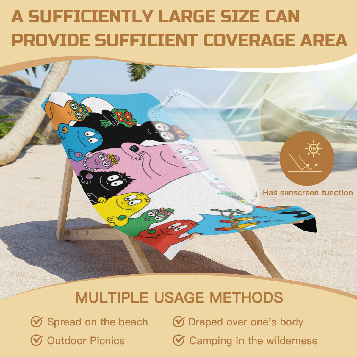 ☀【Barbapapa Element Design】★ : When it comes to bathing and swimming, the beach towel provides the perfect backup with this cool and colorful Barbapapa beach towel. ☀【Perfect Gift for Barbapapa Lover】★ : 100% Microfiber, soft, quick-drying, and sand-proof. This is NOT a plush, oversized towel. Unique Design & Compact Size: Measures 30 x 60 inches(75 X 150 CM), Net Weight: 280 Grams. Folds compactly, making it easy to carry and ideal for all. ☀【Indoor & Outdoor USE】★ : This versatile towel brings colorful style and cozy comfort to a bathroom, pool, or beach near you. Whether you are lying on it to soak up the sun or using it to soak up the water after a swim, it’s always got them covered. As a cute home decor accessory, this towel can double as a fun poster or decal on your bedroom wall. ☀【Easy Care】★ : You can throw the towel into the washer and dryer without worrying about the colorful animated cartoon characters fading, making it a fun bathing, swimming and shower accessory. ☀【Item Includes】★ : A beach towel measuring 30" (W) X 68" (L). It's large, fun and easy to wrap around everyone. The towel is lightweight and folds easily to carry when traveling. On Jun 17, 2025 at 08:43:05 PDT, seller added the following information: