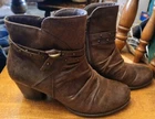 Step out in style and comfort with the Baretraps Rainly ankle booties. These brown booties feature an almond toe shape, a zip closure, and a studded leather band accent for a touch of edginess. They also feature a knot detail on the side. They are perfect for any occasion, whether it's for travel, casual outings, or business meetings. Signs of wear on upper front and toe area. (See last 2 pictures)