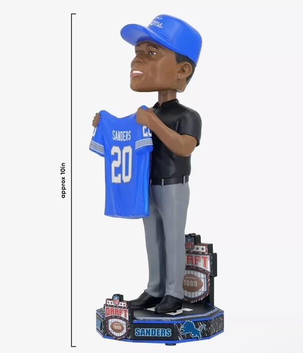 This Barry Sanders Detroit Lions bobblehead is a must-have for any NFL fan! Featuring the iconic draft pick, this collectible is perfect for showing your team spirit. The bobblehead is brand new in its original box, and is officially licensed by the NFL. With a size of 10 inches and dressed in blue, this unisex bobblehead is a great addition to any fan's collection. It is a great gift for any Detroit Lions fan, or for anyone who loves football. The bobblehead is a part of the Foco Near Me program, and will be shipped the same day it is ordered. Add this to your collection today!