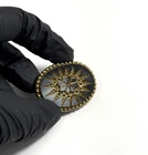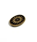 This vintage brooch features a medallion shape with black onyx glass and golden star ornaments on a gold tone base. It is approximately 2.5 inches by 2 inches in size and showcases a Victorian revival style. The design includes floral motifs, making it a fashionable accessory in the theme of medallions.