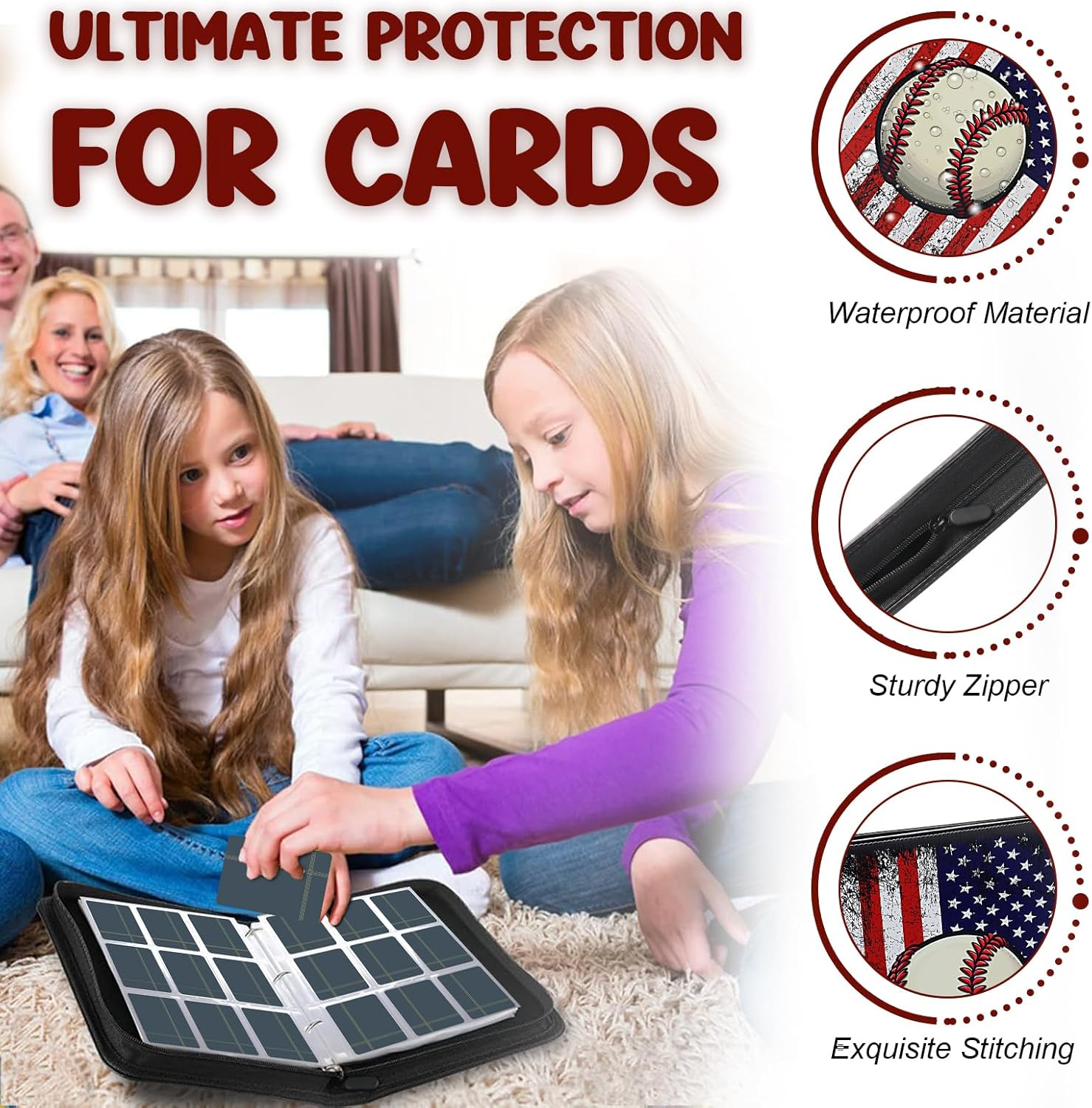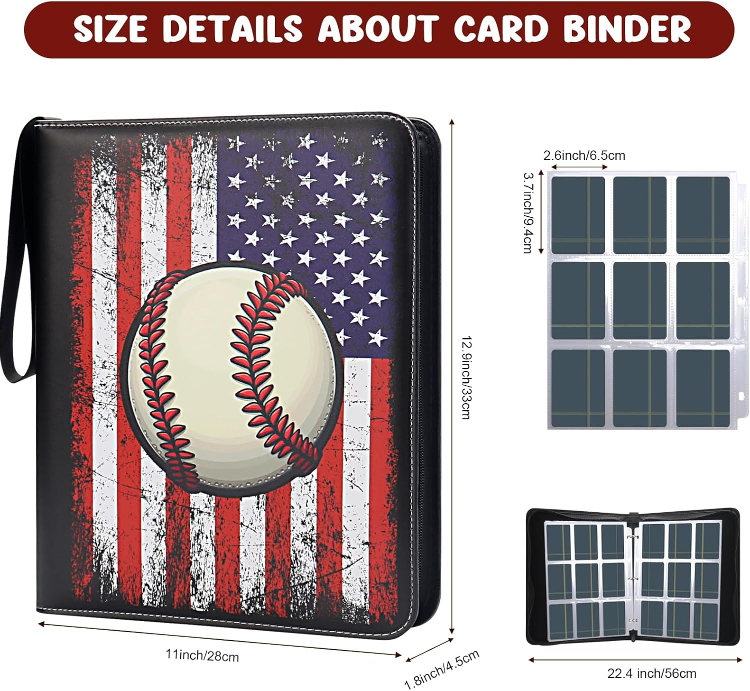 Premium Quality Material Card Binder - Our baseball binder crafted from high-grade PU material for a luxurious feel, which offers superior protection for your valuable cards. The surface is scratch-resistant, easy to clean, and sturdy, ensuring long-lasting performance. The 3-ring buckle, made with stainless steel, allows for easy opening and closing without the risk of scratching your hands. The convenient design also allows for effortless addition or removal of card sleeves Multi-protection for Your Trading Cards - This album card holder adopts a closed zipper design to prevent the card from falling. The protective sheets are made of thick waterproof material, dust-proof and moisture-proof, which effectively protects the card from fading and staining 900 Pockets Large Capacity - The trading card collection 9 pocket has 50 double-sided protective sheets to hold up to 900 cards. Sports card binder can store and display all the trading cards you have, the cards can be stored in an orderly manner, instead of throwing them everywhere, which cultivates children's storage integration ability and help children develop good storage and organization habits Baseball Element and Portable Design - With the baseball zipper binder 900 pockets, take your cards wherever adventure leads. Sporting a comfortable wristband for easy transportation, your collection is no longer confined to one place. The exclusive and elaborate baseball cover design makes this card holder stand out, it will be an great idea for baseball enthusiasts. Now, you can enjoy and share your passion for trading cards anytime, anywhere Versatile - This sport card collection isn’t just for baseball cards; it's a versatile solution fit for all standard size collectibles. From sports cards to game cards and even small photos. Our binder brings order and elegance to the display and storage of your cherished items Product Description 9-Pocket Baseball Card Binder for Baseball Cards The surface of this card colletion binder is made of PU leather, which is waterproof, scratch-resistant, and not easy to deform. The fully closed zipper design protects the card in all directions, and the card will not fall out when you hold the card binder at any angle. Trading card holder is ideal for your kids on Thanksgiving, Christmas, birthdays, and other holidays, which help them develop good organizing and organizing habits More Details about Baseball Binder for Trading Cards The protective sheets are made of premium PU materials, comfortable to hold in hands, waterdrops or rain won't seep through, which effectively protects the card from fading and staining. The light transmittance is up to 99%, making the collection content clearer, thicker material, wear-resistant, scratch-resistant, and protect the card better. It adopts a humanized wristband design, which is easy to carry and you can show your collection to friends anytime, anywhere Neatly Organized of Baseball Card Organizer The 9 pocket card binder has 50 double-sided protective sheets to hold up to 900 cards. Sports card binder can store and display all the trading cards you have. The cards can be stored in an orderly manner, instead of throwing them everywhere, never lose your cards again, say goodbye to the clutter of cards, and helps children develop good organization habits Suitable for All Standard Size Trading Cards The baseball card book binder not only can store trading cards, game cards, sports cards, coupons, business cards and other standard-size cards but also can as the present for Thanksgiving, Christmas, birthdays, and other holidays for children and your friends, adding different fun to them.