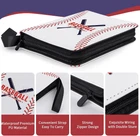 PU Leather Imported Accommodates standard 2.5"x3.5" collection cards. Transparent card pages for easy display, sorting, and organization. Robust 3-ring binder with metal spine ensures durability. Smooth zippers are dustproof and water-resistant, securing cards in place. Crystal-clear display with acid-free, non-toxic, high-definition PP material for card sleeves. Spacious capacity with 55 card sleeves, each holding 8 baseball cards. Double-sided loading can store up to 440 cards. Ideal gift for card collectors. Features a high-quality PU leather cover with a baseball-themed pattern for added aesthetics. Product Description PREMIUM SOFT PU COVER Made of wear-resistant PU material, soft, waterproof, easy to clean and durable without deformation Portable Wrist Strap Handle strap deign allowing you to comfortably carry your card binder wherever you go. WIRING WITH DOUBLE STURE Super sturdy not easy to break, good to protect your card from fading and stain. METAL 3-RING DESIGN Refillable/expandable convenient to add or remove sleeves at will, meet all your collection needs. DOUBLE-SIDE Total 440 pockets of 55 pages (4 pockets per-page) 1 PREMIUM SOFT PU COVER 2 Portable Wrist Strap 3 WIRING WITH DOUBLE STURE 4 METAL 3-RING DESIGN 5 DOUBLE-SIDE