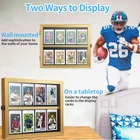 Baseball Card Display Case,8-Slot Graded Card Display with Lockable Graded Card Key Features: 100% Natural Wood: Crafted from 100% solid wood, this baseball card display case is stronger and more durable than MDF alternatives. The elegant finish is fade-resistant, ensuring long-lasting beauty while preserving the value of your PSA graded cards and other collectibles. Crystal Clear Protection: Features 3mm thick HD tempered glass that is scratch and shatter-resistant, offering 98% transparency for an unobstructed view of your treasured cards. This high-quality glass shields your collection from dust, scratches, and damage, keeping your cards in pristine condition. Versatile Display Options: Includes two sturdy metal brackets for easy wall-mounting or tabletop placement, giving you the flexibility to display your collection in any space. Perfect for showcasing baseball, basketball, football, or Pokemon cards. Designed for Collectors: Accommodates up to 8 graded cards with dimensions of 12.6” (H) x 14.57” (W) x 1.77” (D), with shelves spaced 5.6” apart, fitting cards up to 5.4” in height. Ideal for sports card enthusiasts, collectors of graded cards, and Pokemon fans.