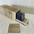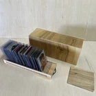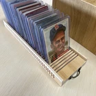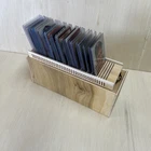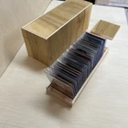 Wooden storage box with removable front lid and slide out tray that holds 40 cards in standard top loaders.
