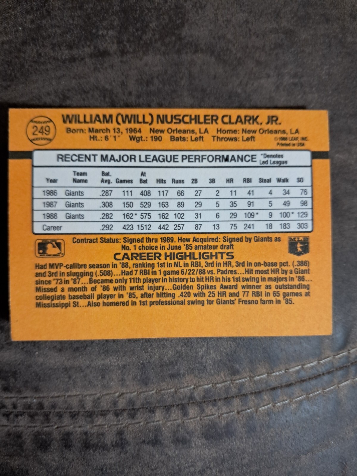 The product is a baseball card featuring Will Clark, a first baseman in the sport. This sports trading card falls under the category of trading card singles in sports memorabilia, cards, and fan shop. The card is in good condition and is a desirable collectible for fans of baseball and trading cards alike.