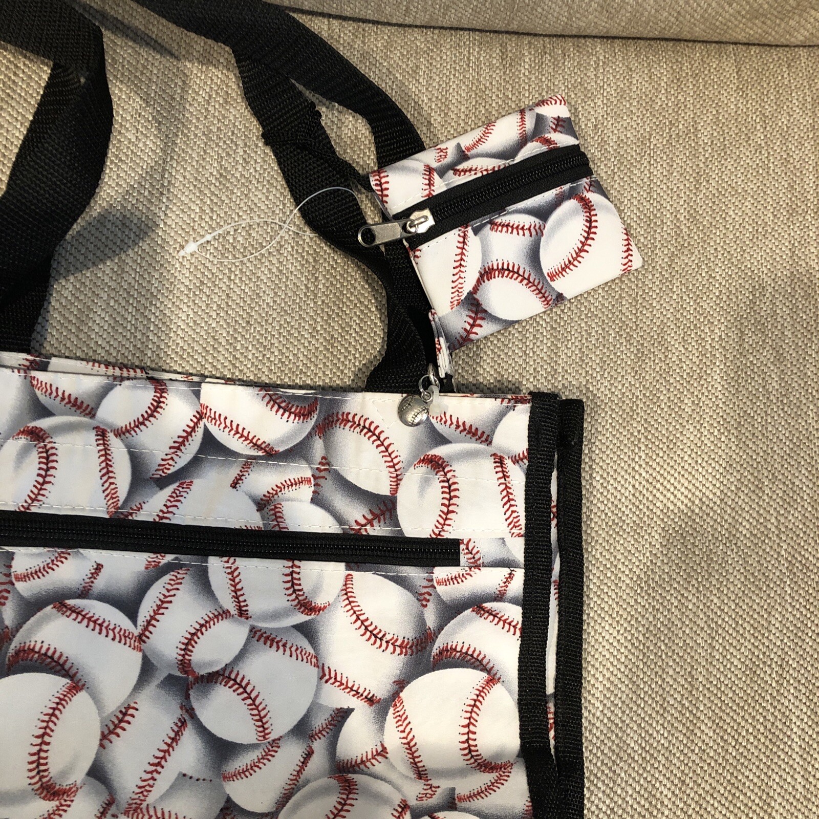 Tote bag with a baseball theme-White with black trim and baseballs 12" X 12" X 4" Small zippered pouch included 4" X 3.5" Outside pocket with velcro Outside pocket with zipper on other side Small inside pocket with zipper It is new without tags...there is still a plastic string that held the tag on the tote