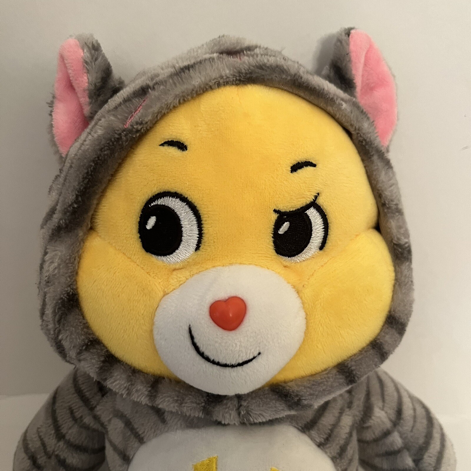 Basic Fun Plush Care Bears Unlock the Magic Plush Funshine Bear Kitty Cat 12" Red plastic heart has wear. White writing is worn. See photo close up.