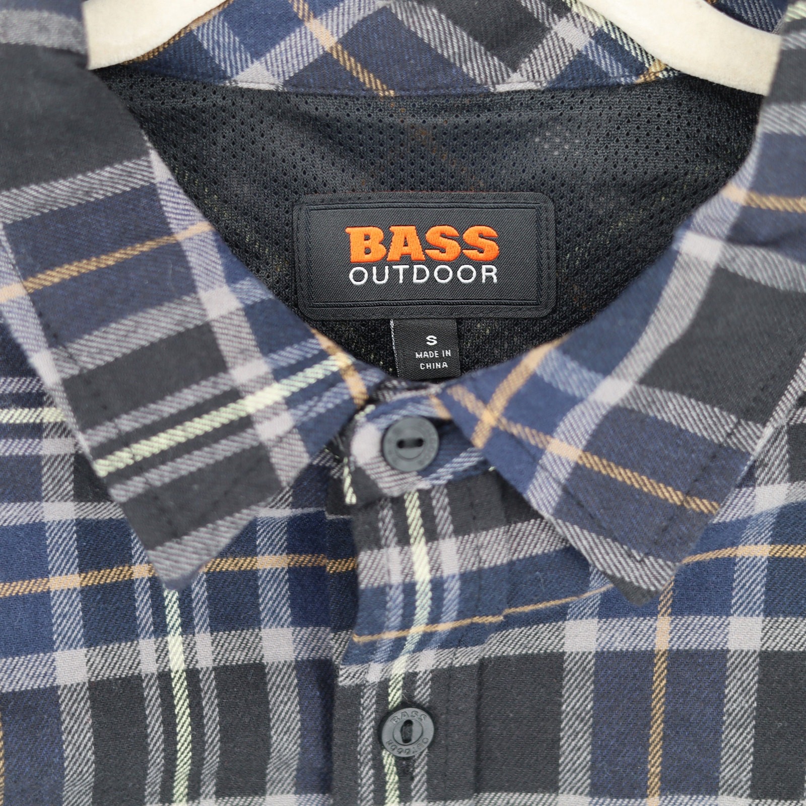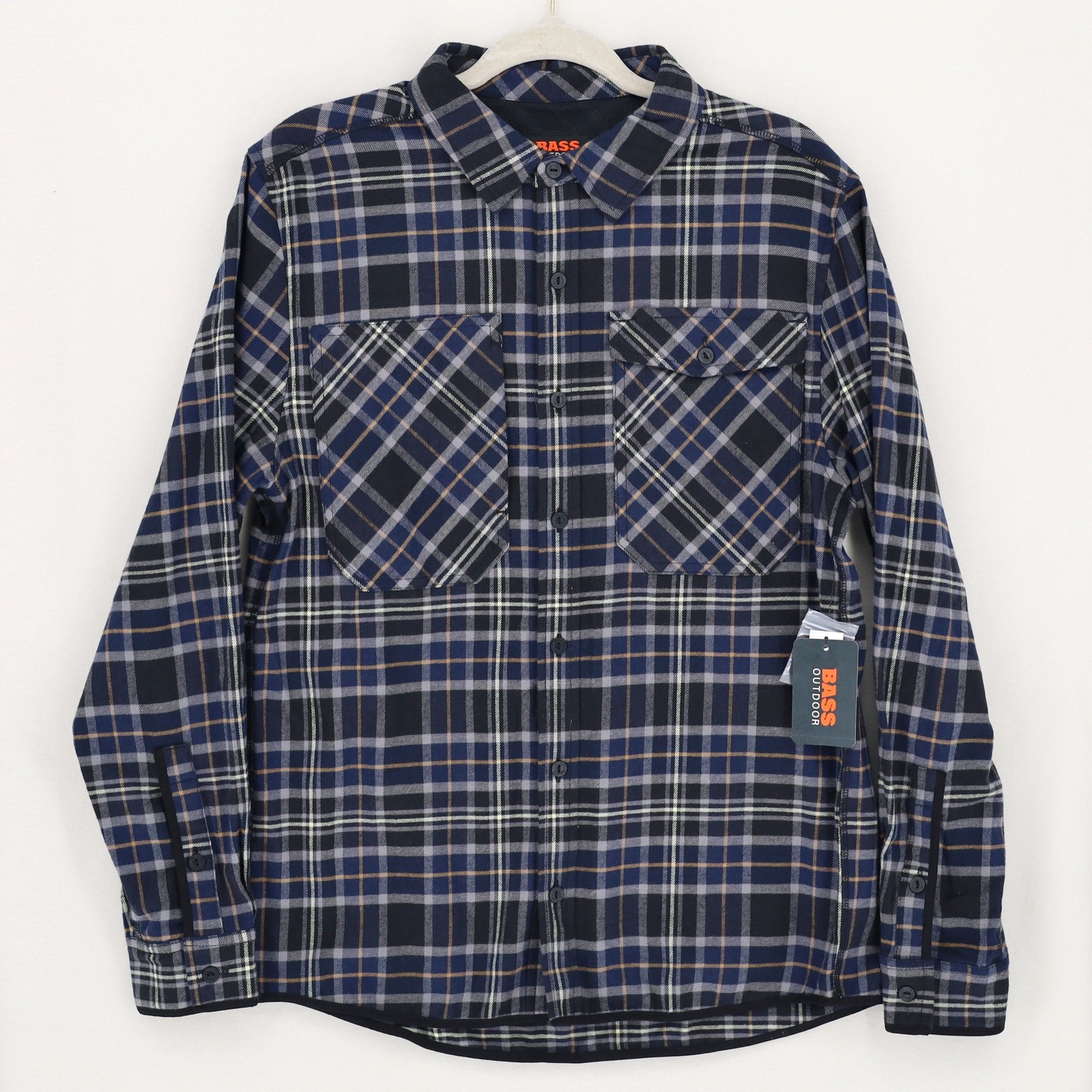 Bass Outdoor Men's Green Plaid Flannel Button-Front Long Sleeve Shirt Size S New with tags Classic fit Long sleeves with button cuffs Point collar Button-front closure Left chest flap pocket Right chest patch pocket Stretch flannel fabric 63% cotton / 35% polyester / 2% spandex Machine wash Length 28" Armpit to armpit 20" Sleeve 25"