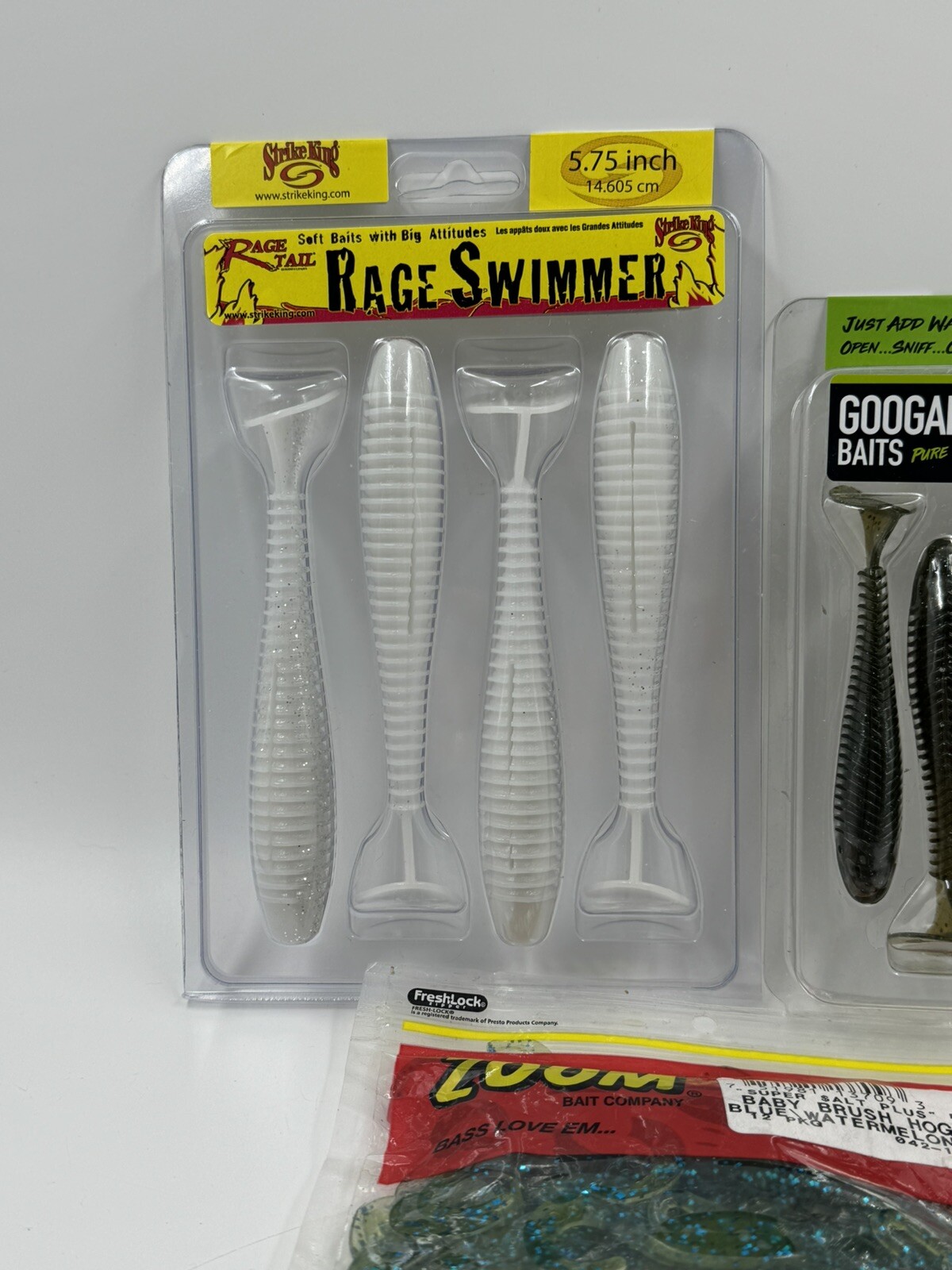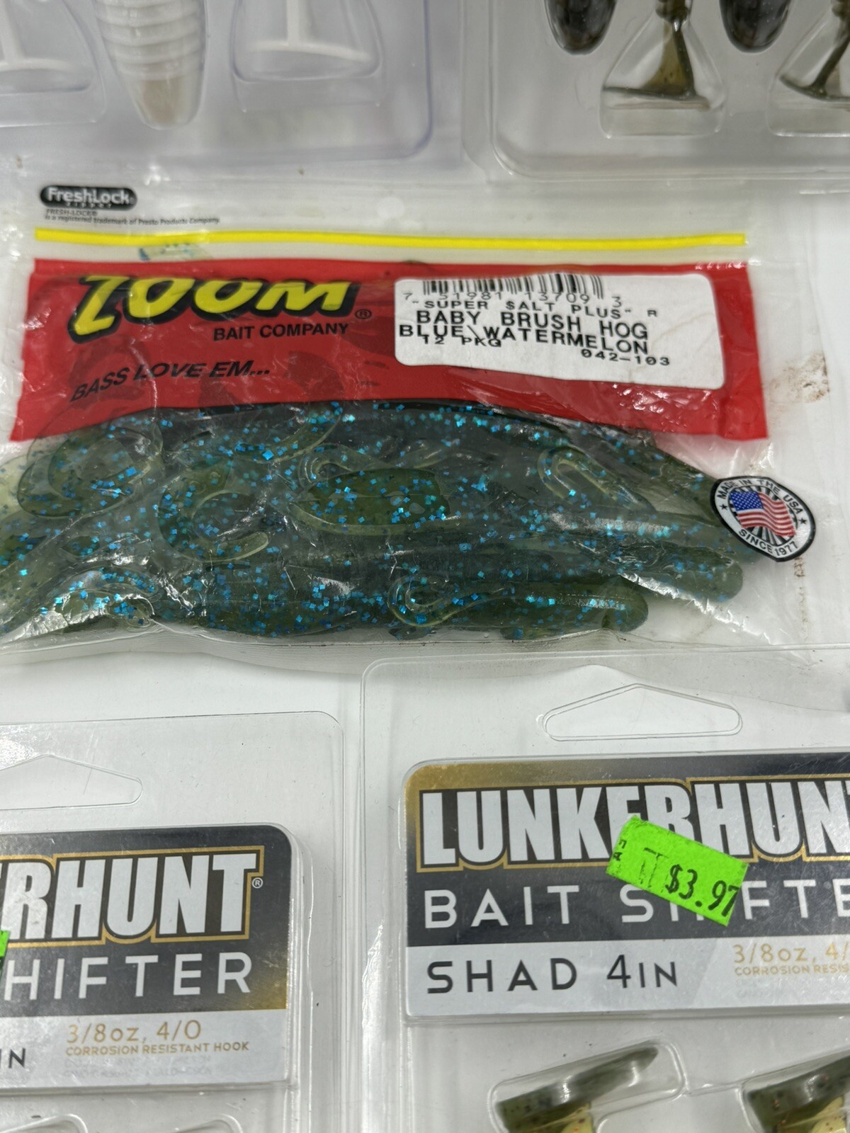 2 packs of lunkerhunt bait shifters minnow & shad green pumpkin, rage swimmer 5.75 white, Googan saucy swimmer 3.8 green pumpkin, zoom baby brush hog blue watermelon( might be missing a few from bag)