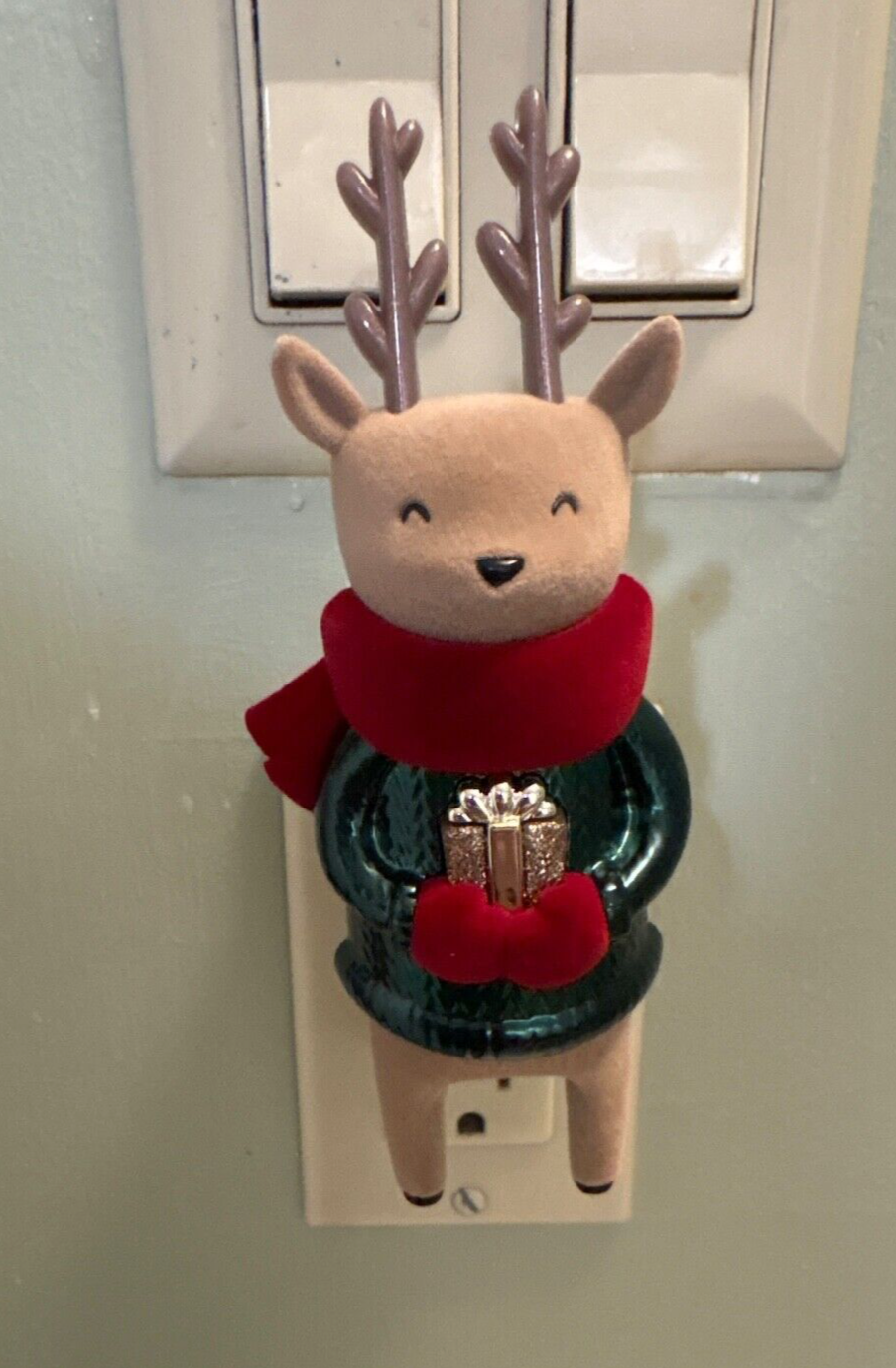 ( 1 ) Bath & Body Works Christmas Festive Reindeer Wallflower Plug; NWT 🎄super cute for Christmastime🎄 🎅brown velvety reindeer with burgundy scarf and mittens, green jacket, dark brown eyes and nose, and holding a gold present🎅
