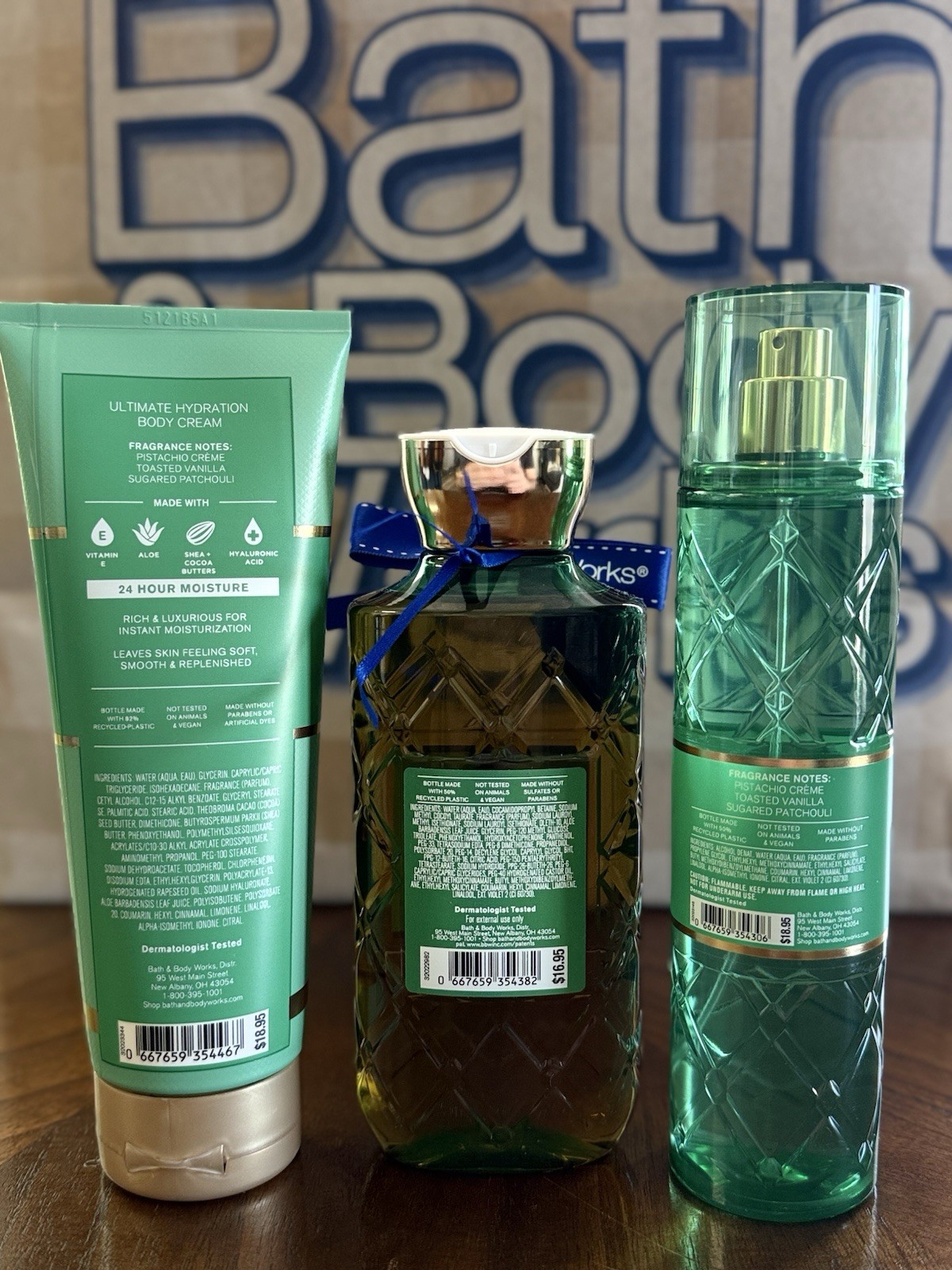 The Bath & Body Works PISTACHIO GLAZE Set includes a luxurious body cream, body wash, and fragrance mist in a rich pistachio glaze scent. This set is designed for ultimate hydration and moisturization, with active ingredients like aloe vera and shea butter to nourish all skin types. The products are cruelty-free and made in the United States, making them a perfect choice for daily use for adults looking to pamper their skin with a green-colored, refreshing pistachio scent.