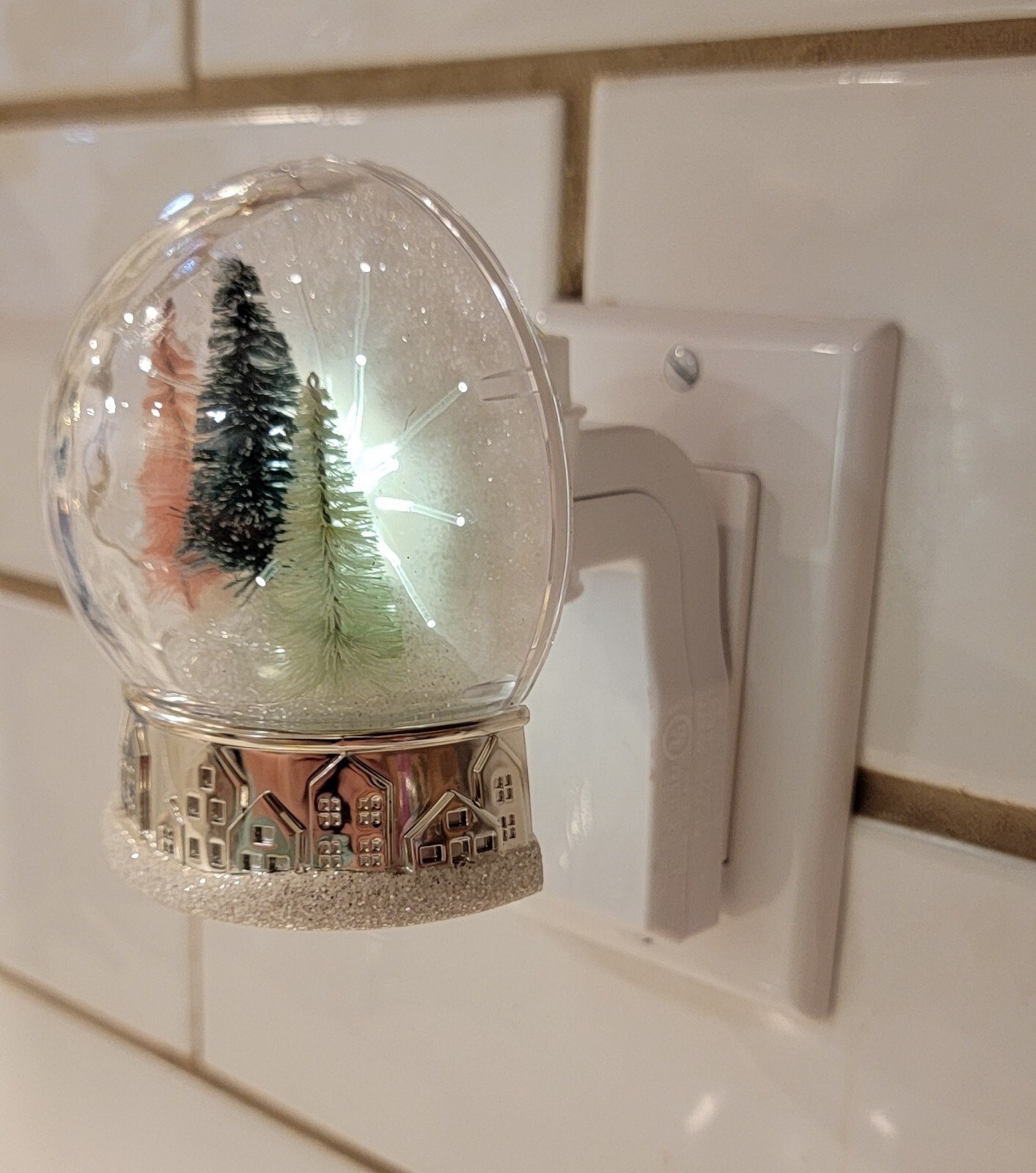 Bath & Body Works Wallflower Christmas Tree Snow Globe Plug In Light up. Preowned Tested May have discoloration on vents where the scent comes out
