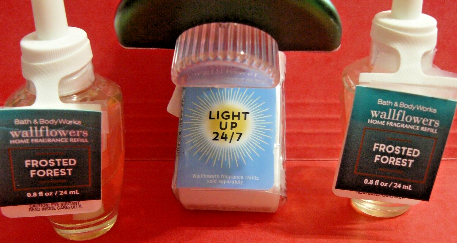 NEW with tags - LOT OF 3 2 each FROSTED FOREST refills with essential oils KEY NOTES: FROSTED JUNIPER, ICY EUCALYPTUS, EVERGREEN BRANCHES Each Bulb is 0.8 fl oz and lasts up to 8 weeks. 1 each CHRISTMAS TREE plug-in DIFFUSER with CUT-OUT HOLES IN IT, with WHITE BASE - (LIGHT UP 24/7) Feel free to contact me with any questions. Comes from a smoke free home. Payment is due within 2 days of purchase. Shipping Handling Fee - FREE* *There could be an additional shipping/handling fee to ship to APO/FPO addresses, as well as other countries, unless you fall under the GLOBAL SHIPPING PROGRAM, then there is no additional fee. Please contact me before purchasing to check. If you don't and it does cost more to ship, the additional shipping will automatically be added to your invoice. Thanks....