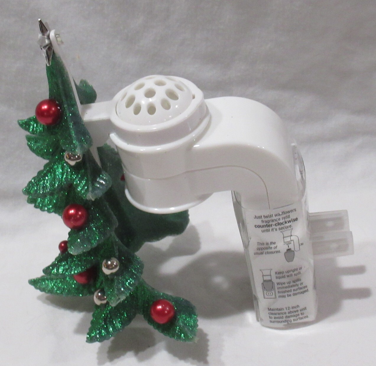 Bath & Body Works Wallflowers Fragrance Plug Unit CHRISTMAS TREE To use unit with a bulb: - Twist wallflower fragrance refill counter-clockwise until its secure - This is OPPOSITE of usual closures - Keep unity upright when bulbs are screwed in to avoid liquid from spilling and damaging unit and plug. - Wipe up any spills immediately as bulbs contain potentially damaging oils - Maintain 12-inch clearance above unit to avoid damage to surrounding surface - Unit contains a rotating plug. - Unit is Energy-Smart - uses less than 5% the energy used of a 60 watt bulb. Bulb Information (BULBS SOLD SEPARATELY!!!): - Each bulbs lasts for approximately 6-8 weeks. - Use only with a properly functioning 120 VOLT electric outlet and a Wallflowers Fragrance Warmer. - Once bulb is empty, replace it. DO NOT refill. - Always keep bulb upright to prevent fragrance leakage.