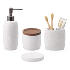 【4 Piece Bathroom Accessory Set】:Includes 1 x soap dispenser,1 x tumbler,1 x Cotton Jar, and 1 x soap dish. Organize and enhance your bathroom quickly and effortlessly. 【Embossed Designt】: The tropical leaves embossed design on a white ceramic body is unique and characteristic. The simple yet subtly decorative design could go well with various bathroom decoration styles. 【Large Cotton Jar】:Our apothecary jars with wood lids can decorate your powder room, bathroom vanity, makeup table, and more perfectly. It’s great for storing and organizing Q-tips, cotton balls, cotton swabs, cotton round pads, floss picks, hair timebands, makeup brushes, pens, clips, and more. 【Quality Soap Pump】:Our bathroom set accessories, exquisite fitting with a premium pump make it easy to squeeze out liquids, and fit tightly to prevent leakage. Also can prevent rust and last for a long time. 【High-Quality Ceramic Construction】: Each piece in this set is made from high-quality ceramic, ensuring durability, resistance to moisture, and a long-lasting finish that will maintain its beauty over time. leakage. Also can prevent rust and last for a long time. 【Easy to clean】:Wipe it with a soft cloth or just rinse it with water. The smooth surface feels nice to touch, there are no sharp or rough edges anywhere.