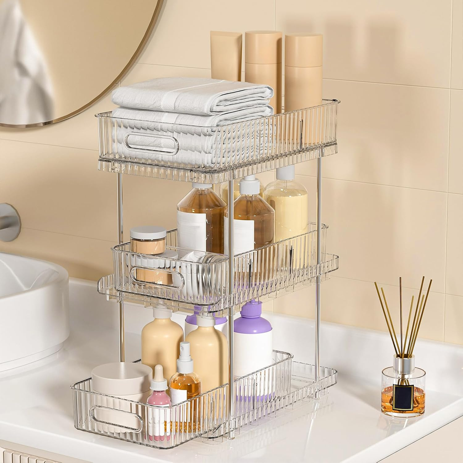 Bathroom Vanity Countertop Organizer: 3-Tier 7.4" x 11.8" x 15.7", Clear Description Features: Efficient Storage Solution: This Bathroom Countertop Organizer offer a convenient and space-saving solution for organizing your bathroom essentials. You can customize the compartments to fit different items, maximizing every inch of storage space Versatile Functionality: This multi-purpose organizer holds everything from cleaning supplies to toiletries. Its clear design is easy to see, so you can quickly find what you need without having to rummage through cluttered cabinets Easy Access and Retrieval: The pull-out feature of this 3-tier organizer ensures easy access to stored items. No more bending or reaching deep into cabinets. Simply slide out the organizer and grab what you need effortlessly, saving you time and effort Sturdy Construction: The bathroom tray is thickened PET materials, is built to last. The sturdy construction can withstand daily use and heavy items, ensuring long-lasting. Say goodbye to flimsy organizers that break easily Maximize Space: Easy Access Slide-Out Design for Quick Reach to Everyday Essentials With this pull out cabinet organizer. Utilize the often underutilized area under your sink and transform it into a well-organized storage space Product Details: Room Type: Bathroom Number of Shelves: 1 Special Feature: Drawer Style: Vintage Finish Type: Polished Brand: Fowooyeen Product Care Instructions: Wipe with Damp Cloth Size: 7.4" x 11.8" x 15.7" Assembly Required: Yes Recommended Uses For Product: Storage Number of Items: 1 Manufacturer: Fowooyeen Item Weight: 3.43 Pounds Furniture Finish: Stainless Steel Tube Installation Type: Countertop Specific Uses For Product: Cosmetics Unit Count: 1.0 Count Product Name: Storage Organizer Item Weight: 3.43 pounds Product Dimensions: 7.44 x 11.83 x 15.68 inches Country of Origin: China Color: Clear Finish: Polished Pattern: Solid Item Package Quantity: 1 Special Features: Drawer Batteries Included?: No Batteries Required?: No Room Type: Bathroom Number of Shelves: 1 Special Feature: Drawer Style: Vintage Finish Type: Polished Brand: Fowooyeen Product Care Instructions: Wipe with Damp Cloth Size: 7.4" x 11.8" x 15.7" Assembly Required: Yes Recommended Uses For Product: Storage MaterialMounting Type: PolyethyleneTabletop Mount Shelf TypeShape: Pull-Out ShelfRectangular Handling We will ship all orders within 3 business day of payment. Delivery We take pride in offering fast and reliable delivery for your orders! We are committed to getting your products to you as quickly as possible. Generally, we would like to inform you that all orders will be delivered to you within 1-3 business days after processing.However, in some cases, delivery times may vary depending on the buyer's location. Especially in remote or rural areas, the expected delivery time may be extended. In such situations, we do our best to ensure that your order reaches you as quickly as possible.If there are any delays, we will be happy to contact you to explain the situation. Our goal is to enhance your satisfaction with our fast delivery times. We work diligently to ensure that your order arrives safely.Trust us and enjoy our speedy delivery! Return Policy All items qualify for returns within 30 days of receipt. Buyer is responsible for return shipping on any item that is not damaged. Feedback We take our reputation seriously, we buy and sell online, so we understand the value of trust. If you are unsatisfied with your order, please contact us and we will work with you to resolve it to your satisfaction.