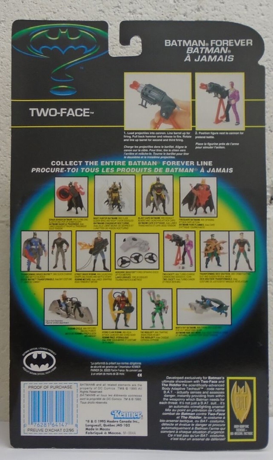 Batman Forever Movie - 5" Two-Face Tommy Lee Jones By Kenner 1995. Includes Turbo Charge Cannon, Good/Evil Coin, Missiles, and Gun. Mint On Canadian Card. Card Has Minor Shelf Wear. This would be a fantastic addition to any Batman collection. We Combine Shipping on Multiple Purchases! Action Toys Has Hundreds Of DC and Batman Toys In Stock!!
