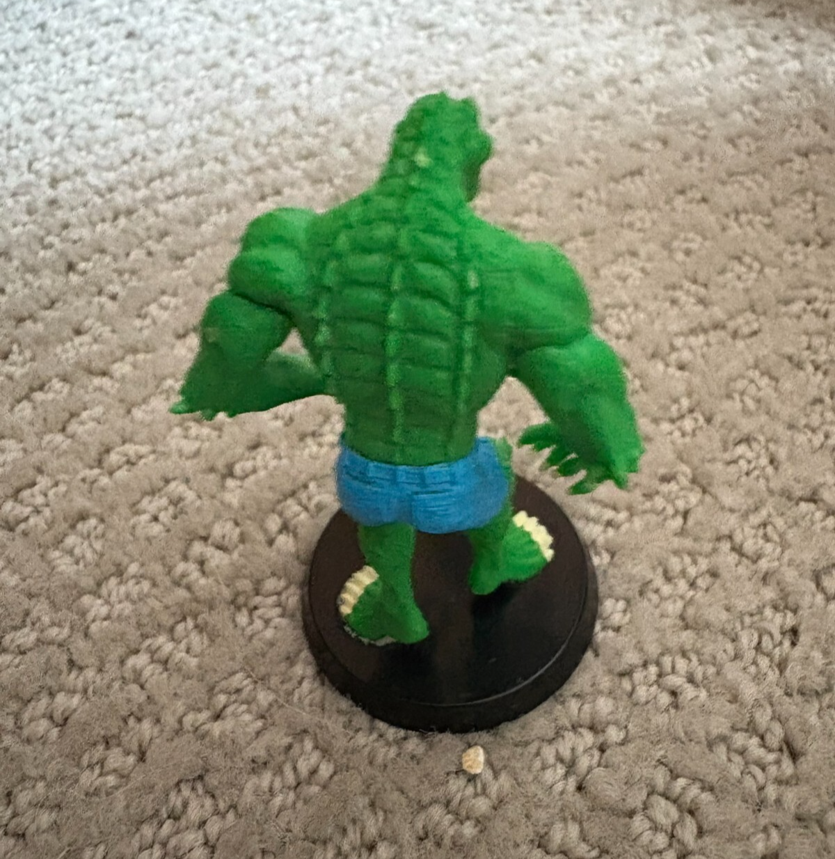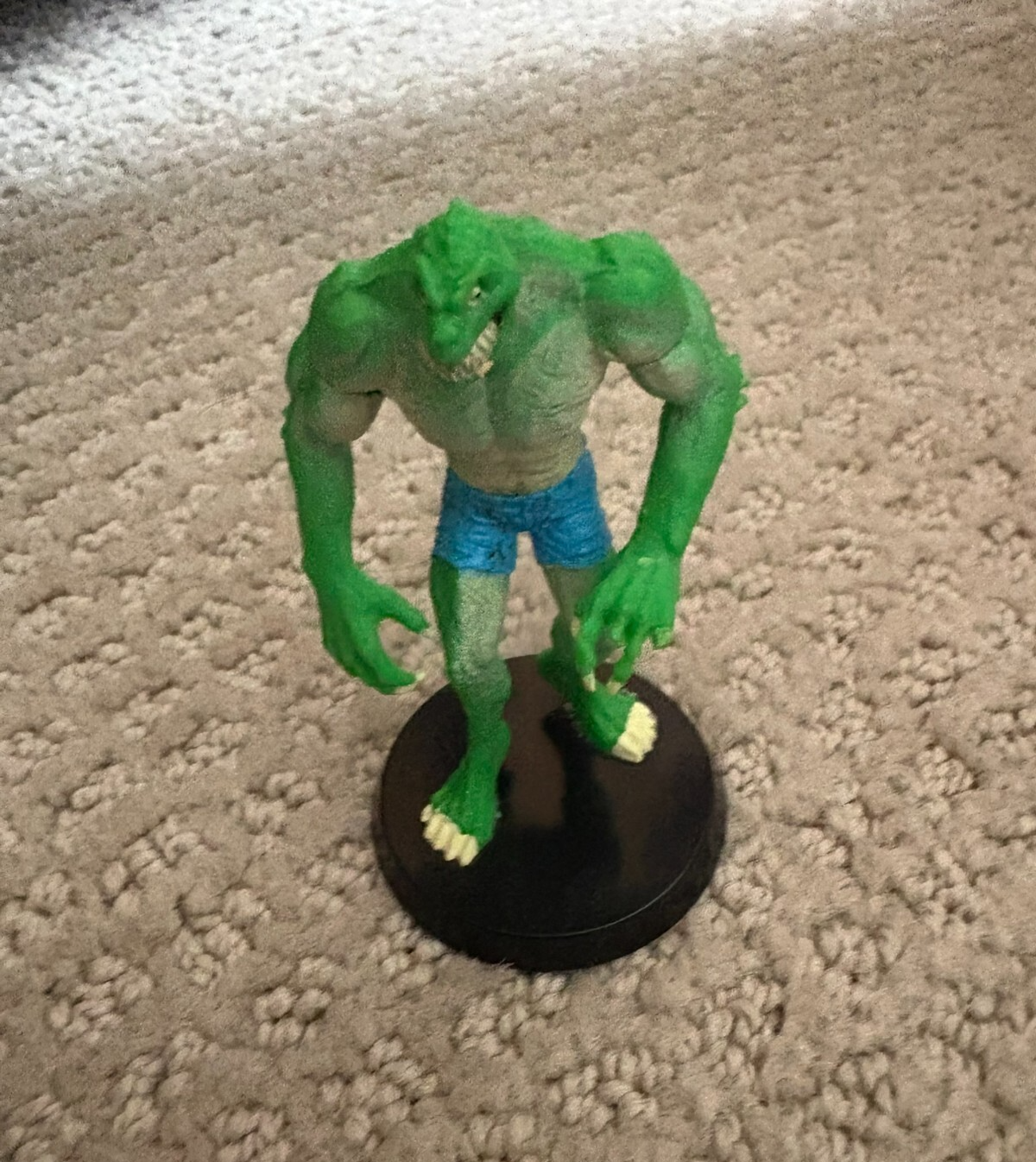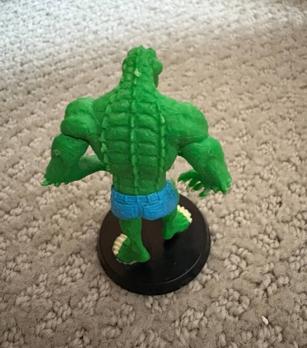 This listing is for a preowned Batman Killer Croc figure by Monogram. Standing approximately 2 inches tall, this green reptilian villain features his signature blue shorts and a menacing grin. The figure is in excellent condition and comes with a sturdy black base for display. Perfect for collectors or fans of the Batman series.
