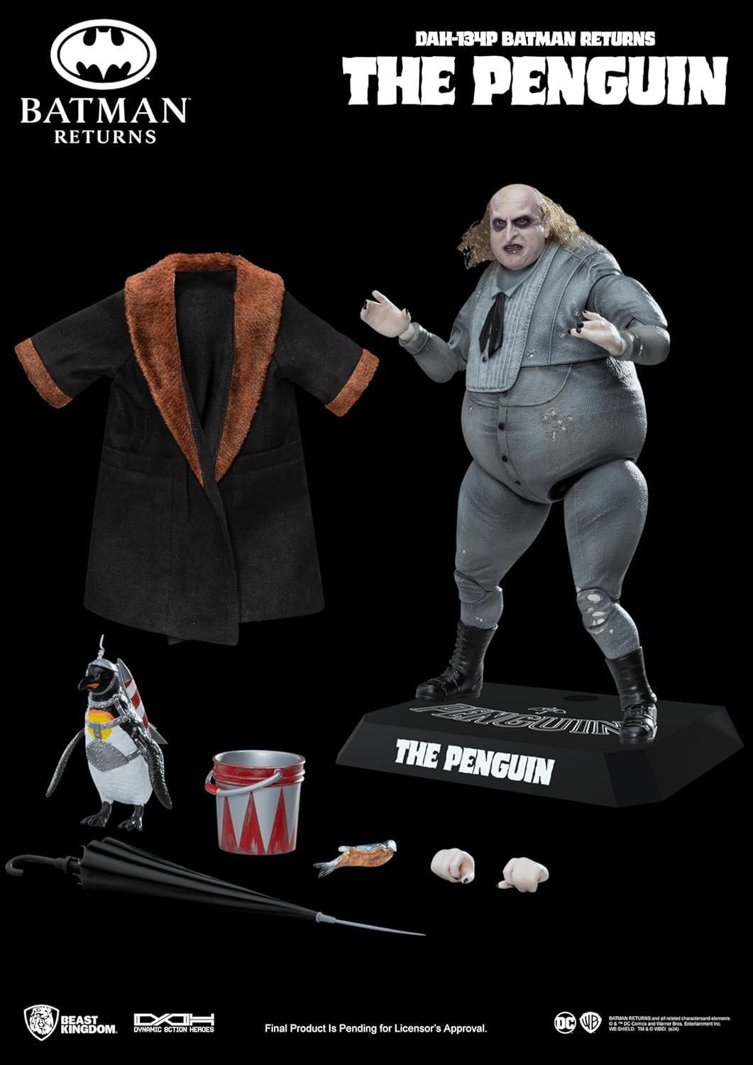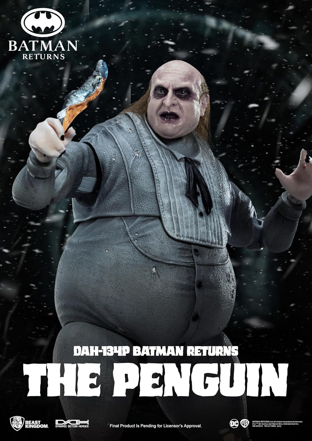 Further Details Title: Batman Returns: Penguin DAH-134P Dynamic 8-ction Figure Condition: New Description: From Beast Kingdom NA. In Batman Returns, Danny DeVito's portrayal of the Penguin, Oswald Cobblepot, is one of cinema's most iconic villains. As Gotham City's criminal mastermind, the Penguin combines intelligence and strategy with a tragic backstory and desire for acceptance, making him one of Batman's most compelling foes. To honor this character, Beast Kingdom proudly presents the latest addition to its DAH series, DAH-134P Batman Returns The Penguin. This figure faithfully captures the Penguin’s dark look from the film. The head sculpt highlights the facial details, rooted hair creates his messy locks, and the skin texture reflects his unique expression. The body replicates his rounded physique and signature gray suit. The coat, made of quality fabric, includes brown velvet-like accents on the collar and cuffs, with interior details like lining and pockets. This figure has 18 points of articulation and includes interchangeable hands, along with the signature umbrella, mini weaponized penguin, bucket, fish, and an extra set of hands. Limited to 3,000 sets worldwide, with a collector's certificate., this is a must-have for Penguin fans. Release Date: 11/23/2024 Age Level: Ab 15 Jahren Brand: Beast Kingdom Item Weight: 453g Item Width: 228mm Item Height: 165mm Color: Multicolor Material: Plastic Type: Action Figures Item Length: 304mm MPN: DAH-134P A Beast Kingdom import Faithfully captures the Penguin’s dark look from the film The coat, made of quality fabric, includes brown velvet-like accents on the collar and cuffs 18 points of articulation Includes interchangeable hands, umbrella, mini weaponized penguin, bucket, and fish Missing Information? Please contact us if any details are missing and where possible we will add the information to our listing.