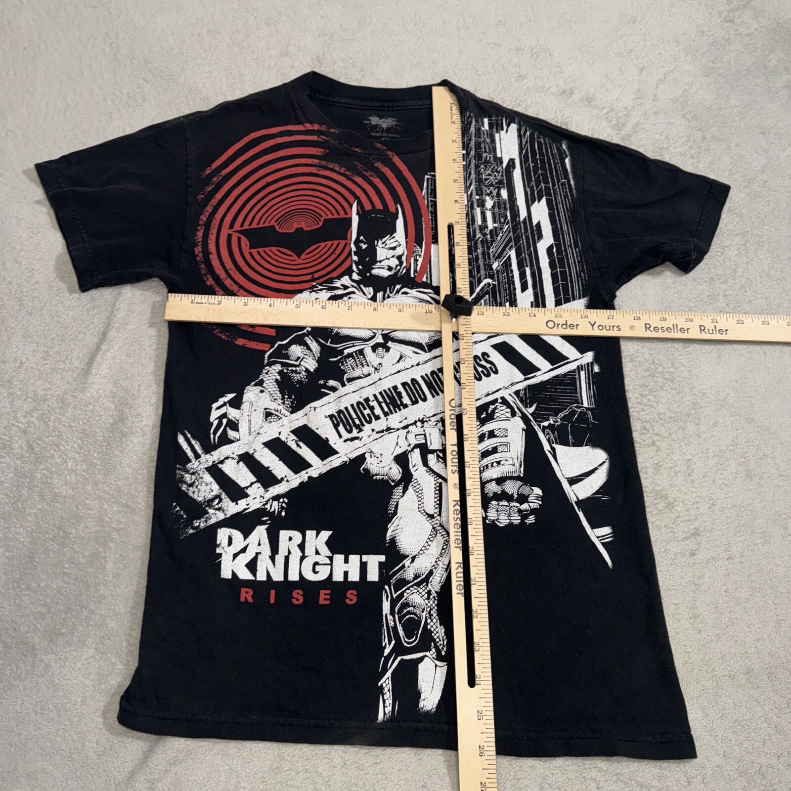 This black Batman t-shirt features a huge graphic of the Dark Knight from the movie The Dark Knight Rises. Made of cotton knit fabric, this shirt has short sleeves, a crew neck, and a regular fit. It is available in size S for men and is perfect for fans of the Batman movie franchise. The shirt is not vintage and was manufactured in Mexico. It is an all-season t-shirt that can be worn in any weather and is a great addition to any Batman fan's wardrobe. The shirt is branded with the Batman logo and is part of the Batman character family. Get ready to show off your love for the Caped Crusader with this awesome t-shirt!