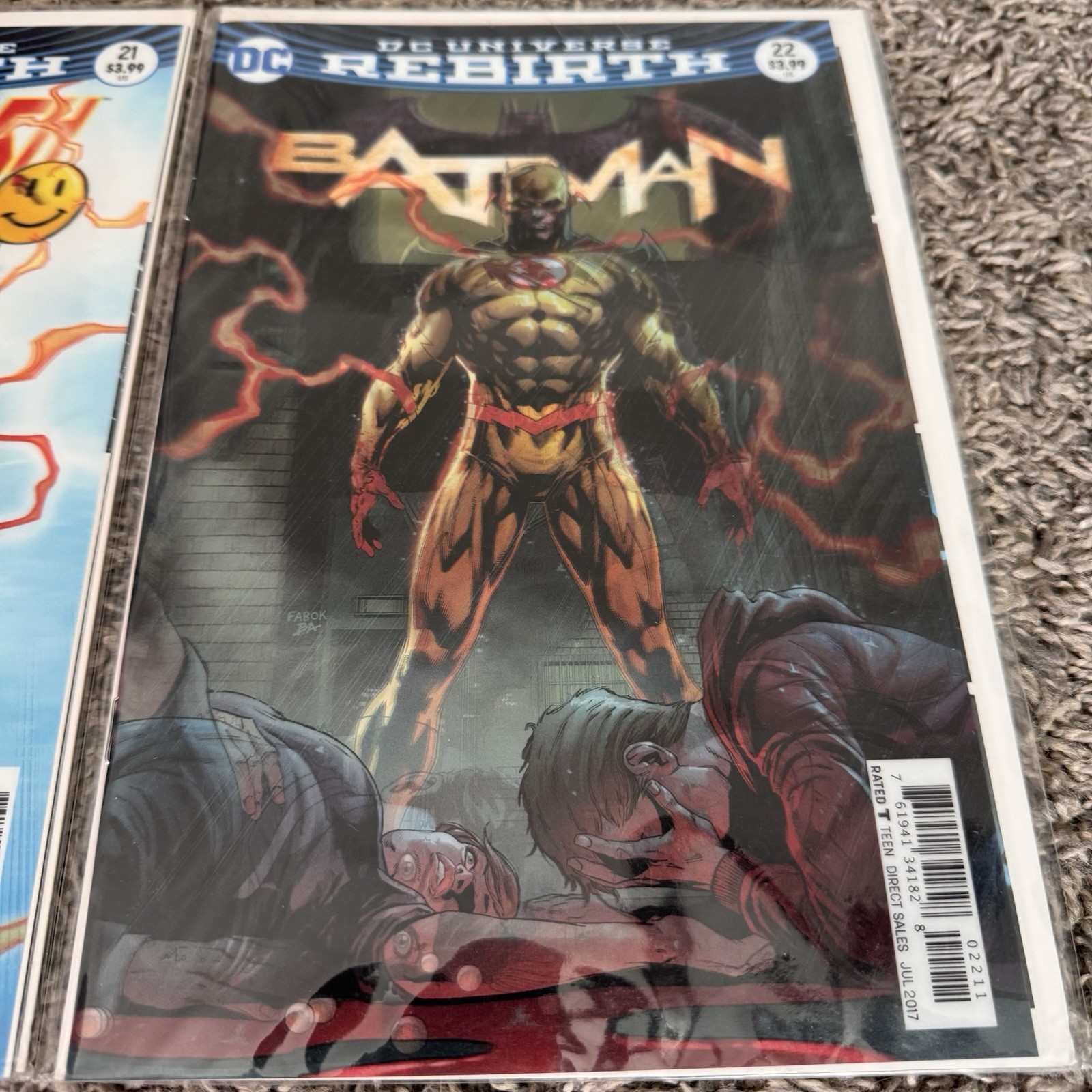 DC Rebirth crossover comic lot featuring “The Button” storyline. Includes Batman #21, The Flash #21, and Batman #22. Covers by Jason Fabok with the iconic Watchmen smiley face. All issues are bagged and boarded, in excellent condition. A must-have set for Batman, Flash, and Watchmen fans!