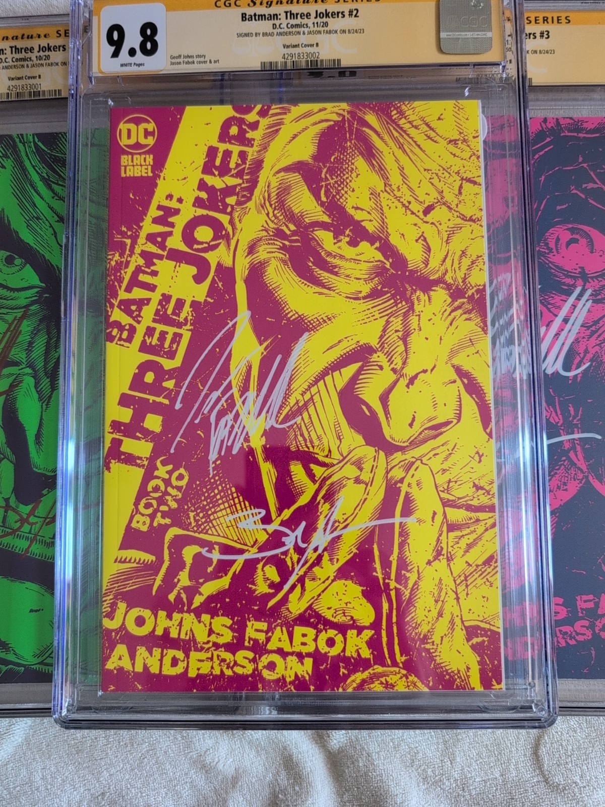 Batman: Three Jokers #1-3 Set | CGC 9.8 Signed by Geoff Johns & Jason Fabok | Sequential Certs! Up for sale is a stunning, high-grade collector's set of Batman: Three Jokers - all three issues graded CGC 9.8 Signature Series, each signed by writer Geoff Johns and artist Jason Fabok. This is a matching sequential-numbered set of all three books, making it an exceptional display piece and a rare opportunity for serious DC or Batman collectors.