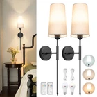 Battery Operated Wall Sconce Light with Remote Control Dimmable Set of 2 White Fabric Shade Indoor Wireless Lamp For Bedroom Living Room, Bulb Included Battery Operated Wall Sconce Set of 2Wall Light Wireless Easy to Install Remote Control, Dimmable and Adjustable Sconces Wall Decor Rechargeable Wall Lamp Gold Premium Design: This pair of wireless sconces feature a stylish round metal plate and a soft, flared white fabric shade. This set of 2 battery-operated sconces is perfect for adding a touch of luxury to your bathroom, brightening up bedrooms, or illuminating hallways and living spaces.(Please charing 100% at the first time use, as the light power maybe run out of during transportation ) Easy to Intall: The wireless wall light fixture set up in no time with our easy 5-minute assembly process. No need for extra tools, complex wiring or the need to call an electrician. We provide a comprehensive manual and all the mounting accessories you'll need. Plus, these sconces are an essential backup during power outages. Flexible Control Methods: Manage your lights effortlessly without having to leave your comfortable sofa or cozy bed. Using the provided remote, you can control the wall lamp, switch the light temperature, and adjust the brightness within a range of 16ft/5m. Alternatively, manual control is always at your disposal. Tailored light brightness: The sconce included LED light bulb, 3 colors temperature 3000k/4000/5000K. You can also choose from 4 levels of brightness, Suitable for different scenes and moods, ensuring long usage times.USB Type-C charger is included for easy recharge. Multi-Scenario Application: The sleek and modern design of our battery-operated wall light fixture can adapt to a wide variety of interior styles, from modern and traditional to minimalist. These sconces allow you to adjust the lights to create different atmospheres, making them a great choice for bathrooms, dressing tables, mirror cabinets, bedrooms, corridors, entryways, living rooms, dining rooms, kitchens and more.