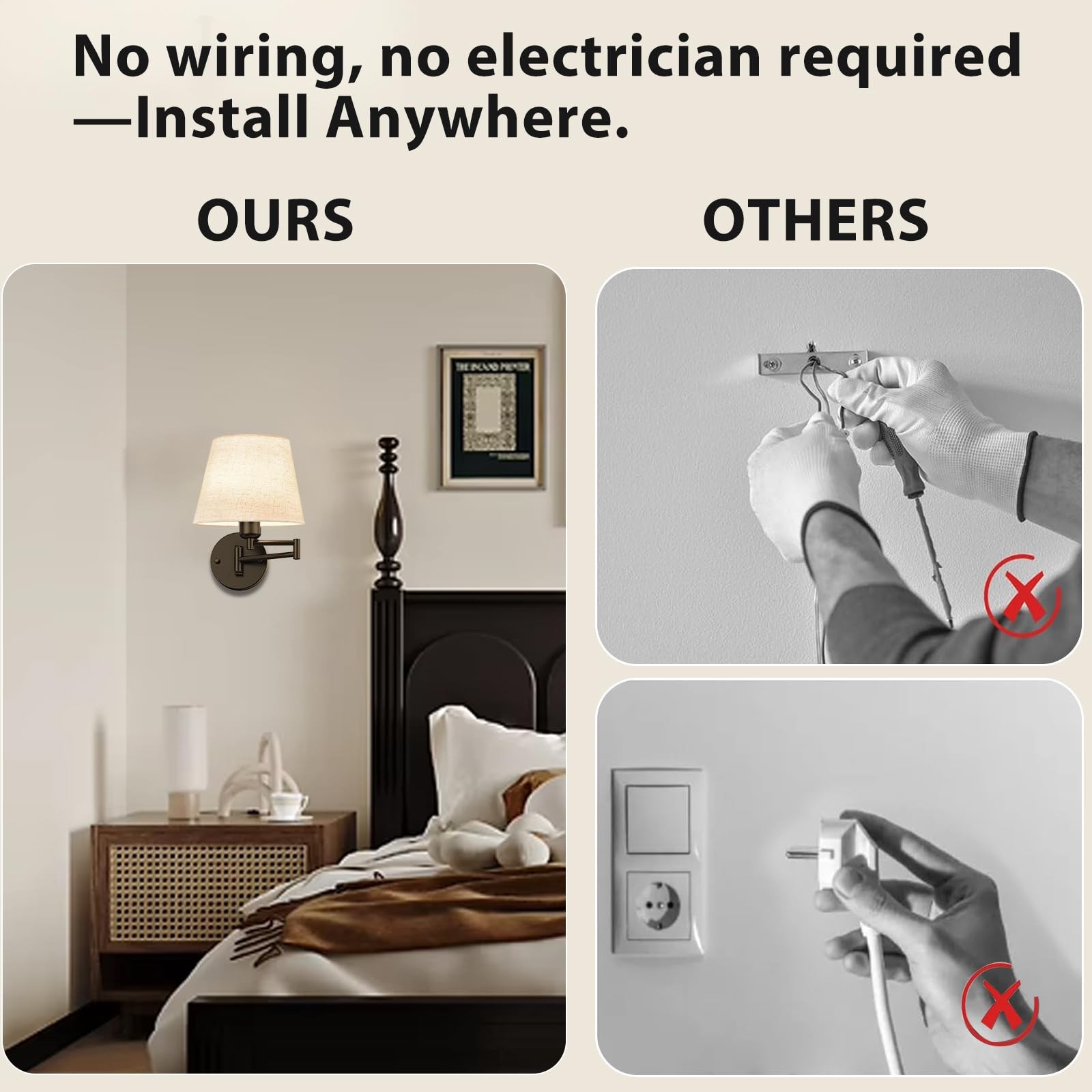 Battery Operated Wall Sconces Set of Two are wireless swing arm wall lights. Equipped with 10000mAh rechargeable bulbs, they offer long battery life. With RGB & 3 color temps, dimmable, they suit moods. The cordless swing arm adjusts flexibly. As wall decor, the black 2-piece set fits bedrooms, living rooms. Remote-controlled, Type-C charging, easy to install without wiring—practical and stylish. 【10000mAh Long-Lasting Wall Sconces】Each wireless wall sconces has a 10000mAh large-capacity removable, rechargeable bulb. Delivers up to 96 hours of continuous light at lowest brightness – no frequent recharging needed. Reliable backup during power outages. 【Multi-Functional RGB & Dimmable】The battery operated wall sconce feature 3 color temperatures plus 12 RGB hues suit mood or decor. 5-level brightness adjusts easily to fit any occasion. 【Flexible Swing Arm】The bedroom wall sconce swing arm can be adjusted 180 degrees left and right freely, and the two arms can rotate 360 degrees horizontally. It extends well, allowing you to freely adjust the lighting angle to meet your lighting needs. 【Modern High-End Style】This sconces wall decor set of 2, designed for bedrooms, living rooms, hallways and other indoor spaces, features a black lamp body with an exquisite design and a stylish fabric lampshade. It fits modern, classic and other styles, enhancing the look of these spaces and foyers alike. 【Remote Control: Effortless and Smart】Adjust brightness/color temp via remote from sofa/bed. Type-C charging, 30/60/120-min auto-shutdown, and last setting memory for hassle-free use. 【Easy Installation & After-Sales Guarantee】The rechargeable wall sconces set of 2 installs easily – no wiring/electricians needed. Fits old homes, rentals, dark corners. 2-year warranty; contact us anytime for issues, solutions within 24 hours.