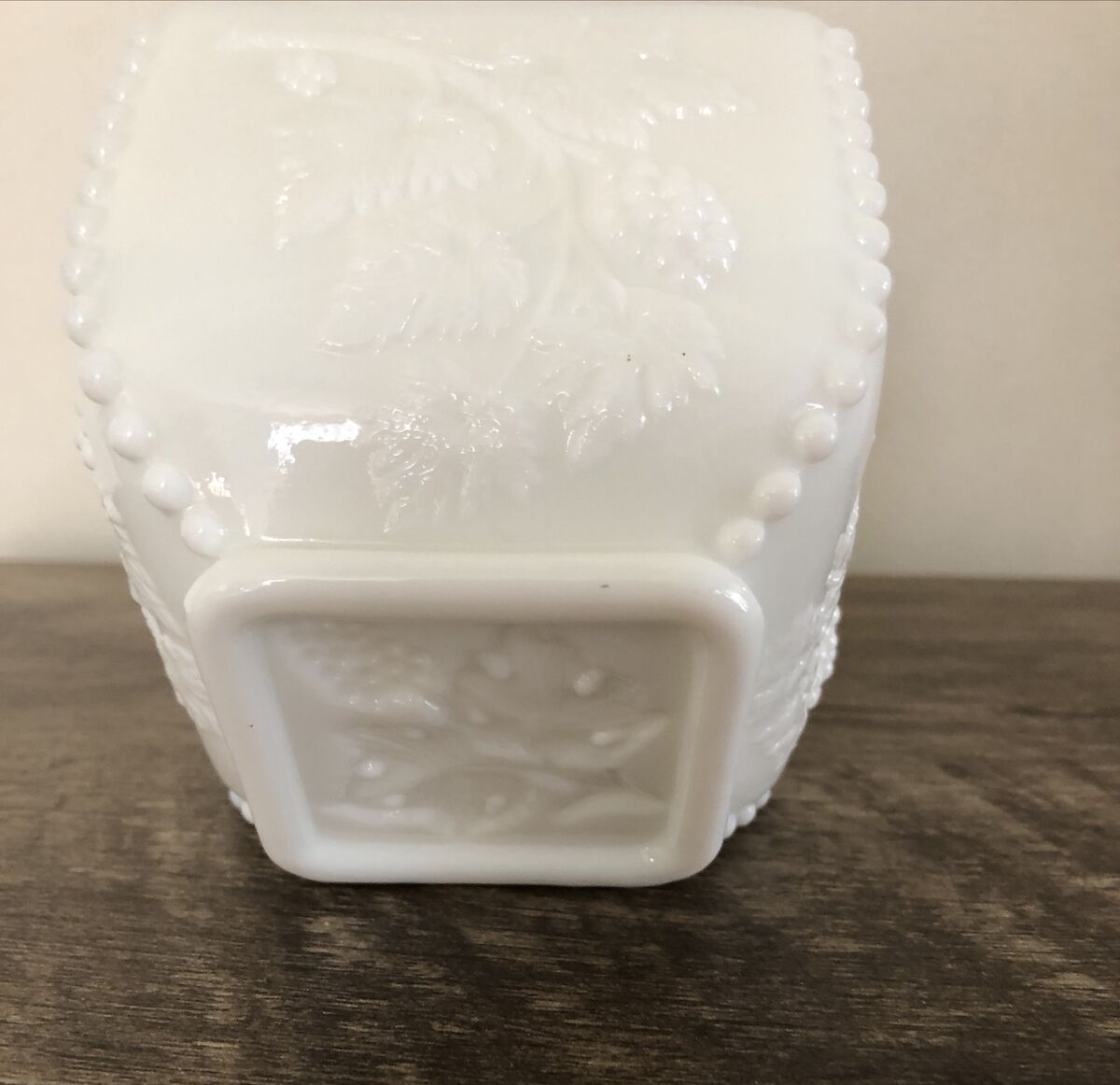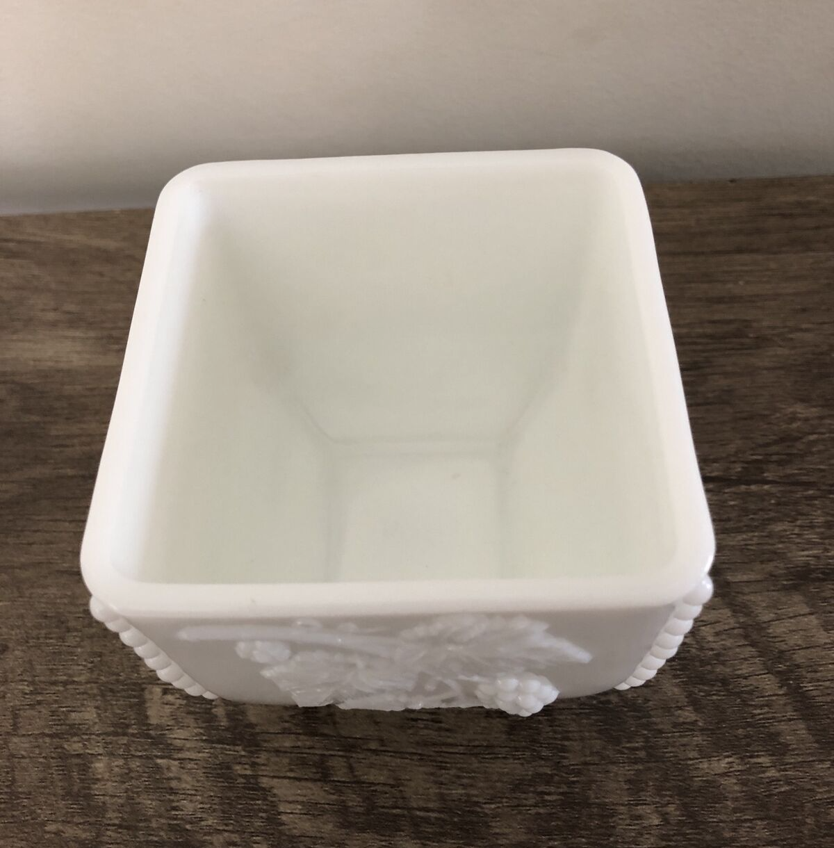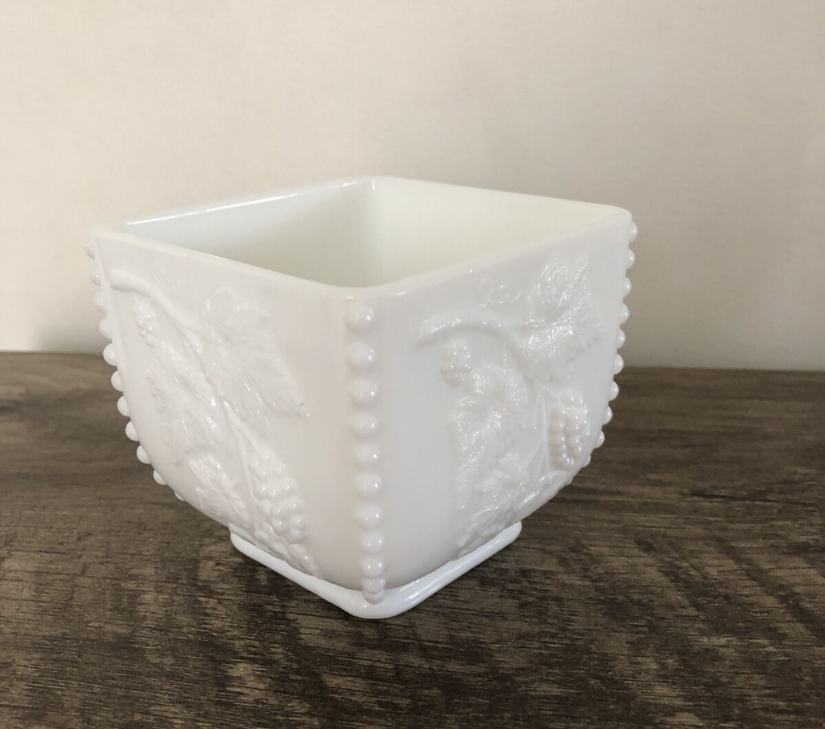Vintage CANDY DISH BEADED EDGE GRAPE WHITE MILK GLASS. Open top (no lid). Measures approx. 3 1/2" x 3 1/2". weighs almost 1 pound. Vintage pieces are not new, and there may be imperfections and wear, please take care to view photos carefully before purchase. Please read the description and view all of the pictures so you are aware of the size and condition of the items listed. I do my best to represent all items accurately. As pictured - I use my own photos. Please look at pictures closely as they are part of the description. Smoke Free Environment US: Fast Shipping with Tracking Provided International: Via eBay International Shipping Program Only Make sure your mailing/shipping address is correct before you submit your order. I won't reship an item for free. This item will be packed with extreme care to insure a safe arrival to its new home. Items may ship with recycled materials. Feedback is very important to us. We strive for 5 stars! Once you receive your item, we ask that you leave feedback for that item. This allows us to know if you are happy with your transaction. In return we will leave feedback for you. Check Out My Other Listings
