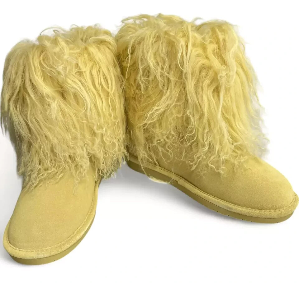PLEASE READ Suede vamp, color white has faux leather vamp 10" Circumference 7" Shaft height Curly lamb upper Wool blend lining Comfort sheepskin footbed Durable TPR outsole Product Color: Wheat -We ship every Monday, Wednesday & Friday. WE OFFER FREE RETURNS FOR ANY REASON. ***THERE IS NO NEED TO LEAVE NEAGTIVE FEEDBACK*** IF YOU HAVE AN ISSUE PLEASE OPEN A RETURN THROUGH EBAY OR CONTACT US SO WE CAN RESOLVE. Thank You.