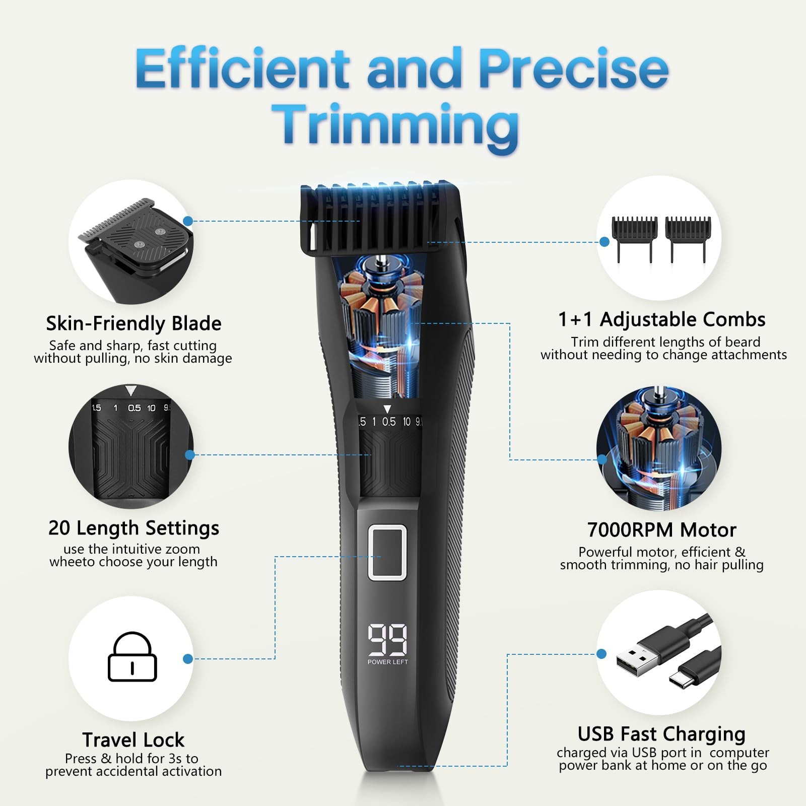 Adjustable Beard Trimmer for Men : Our Precision men's beard trimmer professional with an intuitive zoom wheel with 20 precise length settings(0.5 mm increments up to 10 mm max. length) to choose, our mustache trimmer can trim different lengths of beard, from stubble to short and clean to thick and even,so you can discard the multiple clipper attachments and can adjust the beard trimmer for men to your needs trim anything from a lumberjack-style mustache to stubble 7000 RPM Motor & Stainless Steel Blade: men's trimmer was designed with a unique cutting angle to have its built-in comb lift flat-lying hairs for smooth, single-stroke trimming, with a 7000 RPM powerful DC motor and beard hedger is equipped stainless steel blades is sharp enough that ensure a smooth cutting experience, reduces pulling or irritation, precision cut through the thickest beard facial hair trimming and body hair, it suitable for all skin types, including sensitive skin IPX7 Waterproof For Wet & Dry Shaving: This men's electric beard trimmer built for men looking to take their beard maintenance routine to the next level, featuring an IPX7 waterproof design makes it ideal for wet/dry use, enabling you to trim in the shower and easily clean it under running water for a quick, hygienic experience, effectively handling all hair types, from fine to thick, achieve your desired look with this versatile beard trimmer, meet your all grooming needs USB Chargable & LED Display: Men's face and body trimmer with humanized LED display shows the remaining battery level and reminds you to recharge in time, a high-performance battery life provides up to 60 mins of cordless use after 1.5 hours full charge,men's beard trimmer equipped with Type-C charging device, can be charged via USB port in your computer, power bank at home or on the go, fast charging, cordless design for easy to carry, delivers a smooth and comfortable trimming experience Lightweight with Travel Lock & Secure: Precision beard groomer kit includes a men's beard trimmer, 2 guide combs, 1 oil bottle, a cleaning brush, a USB charging cable, lightweight,built-in travel lock to prevent accidental startup, press & hold 3s to lock the trimmer, thoughtful design is a perfect companion for home/business/traveling, keep you looking handsome at all times without hassle, perfect gift for men, whether it is for birthdays, Valentine's Day, anniversaries, Christmas, Father's Day