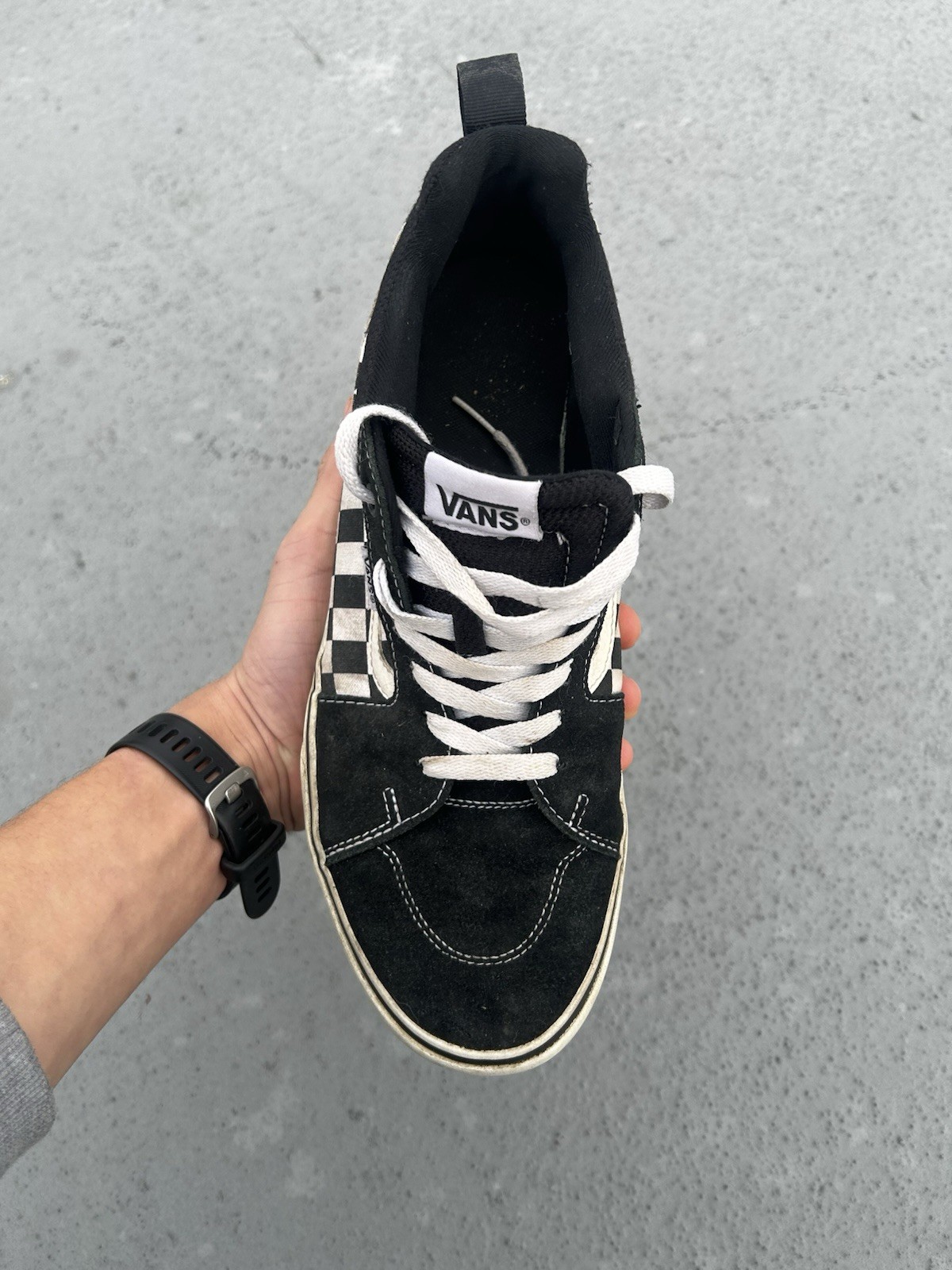 The product is a pair of vintage skater-style Vans sneakers in a checkerboard pattern, featuring a round toe, lace-up closure, and leather accents. These shoes are size 11, suitable for casual occasions, and made of canvas and leather with a rubber outsole. They are designed for comfort and performance, with features like cushioning, slip resistance, moisture-wicking, and breathability. The black color and skater character make them a stylish choice for men looking for a classic and versatile sneaker option.