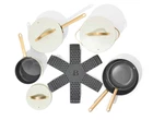 Beautiful 12pc Ceramic Non-Stick Cookware Set, White Icing by Drew Barrymore Made with a non-toxic, ceramic non-stick coating Durable construction for fast and even heating Sleek design with gold pressed forged aluminum lid handles Pressed forged aluminum lid for cohesive look and cooking control Oven safe up to 500°F, including pressed forged aluminum lids lids Dishwasher safe, handwash recommended Compatible with all stovetops, including induction 12-piece cookware set includes: 8" fry pan 10" fry pan 3qt sauté pan 2qt saucepan 5qt Dutch oven 4 cookware protectors 4 cookware protectors