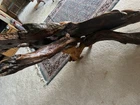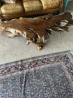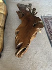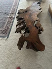 This beautiful coffee table is made of old growth redwood burl wood with an acrylic finish. The table has been fully assembled and is ready for use. The brown color and postmodern style make it a perfect addition to any indoor space. The solid wood handle material and high polish finish add to the table's elegance. This antique piece has a tabletop length of 70 inches, a height of 20 inches, and a width of 34 inches. The table weighs 62 pounds and is ideal for use in any living room.