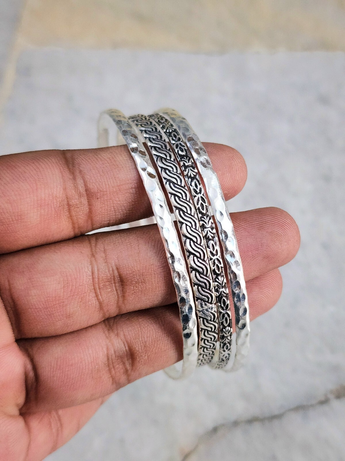 Elevate your jewelry collection with the BohoSilver_Jewels2025 Hammed Bangle Set, an exquisite ensemble of four silver bracelets, each crafted with meticulous care. The bangles are fashioned from high-quality 925 sterling silver, ensuring both durability and shine. Their round shape and excellent cut grade offer a sleek, sophisticated look that's perfect for any occasion. With a setting style that adds a touch of elegance to the piece, these bangles are designed to be both sizable and bezel-set without stones, offering a comfortable fit and a timeless aesthetic. Whether you're commemorating a special event or simply treating yourself, this set is a beautiful addition to any jewelry selection.