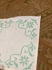 Vintage White Linen Doily with Green Cross Stitch Embroidery - 12" x 12" - Floral Design Measurements: 12" x 12" (square) Condition: Vintage This charming vintage linen doily features delicate green cross stitch embroidery in a pretty floral and vine pattern at each corner. A lovely example of vintage needlework! Features: White linen fabric Green cross stitch embroidery Floral and scrollwork motifs in each corner Four symmetrical corner designs Hand-embroidered details Square shape Simple, elegant vintage style Condition Notes: Shows vintage wear including some discoloration, age spots, and general signs of use consistent with age. Please review photos carefully. Perfect For: Vintage table décor Under lamps or decorative items Tea time or coffee table accent Shabby chic or cottage décor Framing as textile art Vintage linen collectors Cross stitch enthusiasts Wedding or special occasion décor Gift for needlework lovers Display in china cabinet A sweet piece of vintage handwork! The green cross stitch corner designs add a fresh, cheerful touch to this classic white linen doily. Authentic vintage hand embroidery - 12" square!