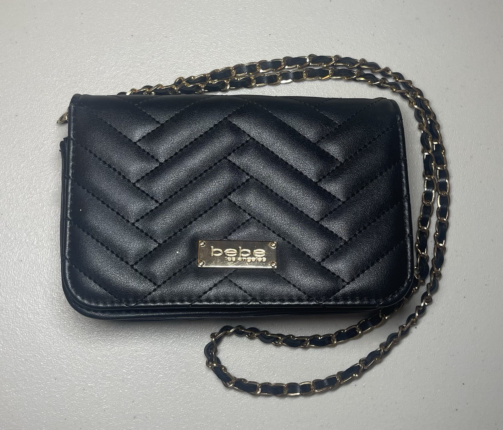 This purse by Bebe Los Angeles is in amazing condition! No scratches or rips in the faux leather, and it has a heavy gold metal chain that is removable. A magnetic snap button holds the purse closed, plenty of space inside with 3 different pockets with plenty of space to carry your essentials in! Approximately 7.5” x 5” with about a 5” depth in each pocket space.