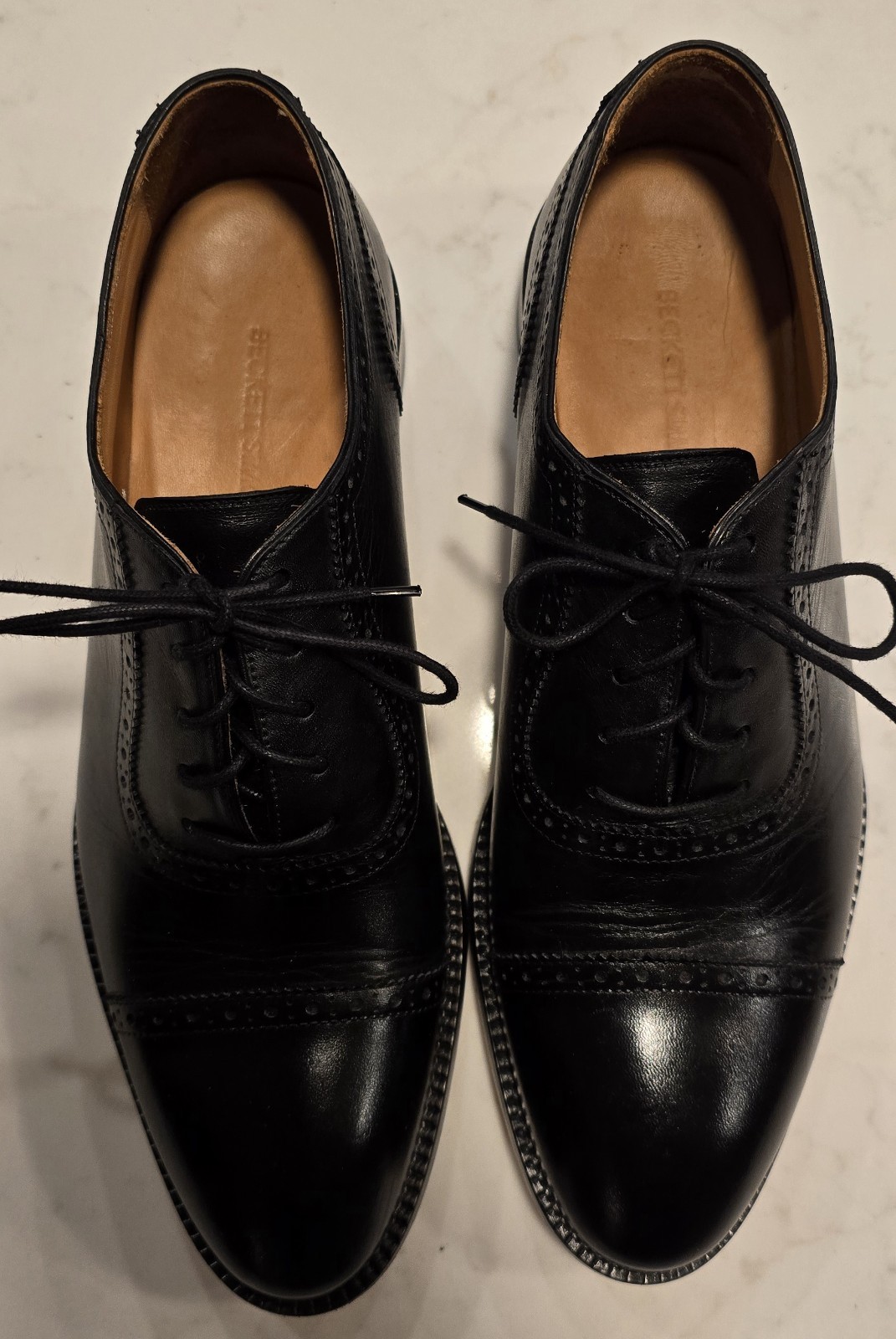 The Beckett Simonon Durant Black Mens Brogue Oxfords in size 9.5 US are stylish dress shoes perfect for formal occasions. These lace-up brogues feature a solid black color with leather lining and accents, exuding a classic and sophisticated look. The leather upper material and outsole ensure durability and quality, making them a versatile choice for summer, fall, and spring seasons. Ideal for weddings or any elegant outfit, these oxfords from a reputable brand like Beckett Simonon are a timeless addition to any gentleman's wardrobe. These will ship with shoe bags.