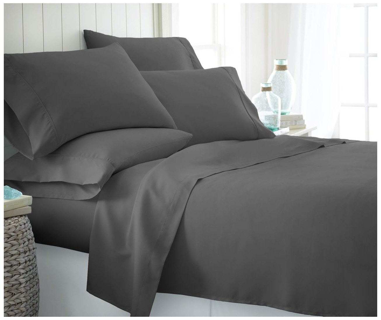 LUXURY AND COMFORT-You'll be amazed at how silky soft, and comfortable these luxurious bed sheets are! ienjoy Home luxury sheet sets are designer sheets at an unbelievable price. The perfect fit for any room in your house - bedroom, guest room, kids room, dorm room, RV, vacation home. Great gift idea for men and women, Moms and Dads, Valentine's - Mother's - Father's Day, Birthday, and Christmas. CLASSIC TAILORED LOOK - Set includes: One flat sheet, one fitted sheet (with deep pockets), and four pillowcases. Twin/TwinXL come with two pillowcases. HIGH QUALITY - Ultra soft microfiber fabric woven with the finest craftsmanship. Good hand feel and very cozy to sleep on. Fade, stain, shrink and wrinkle resistant. Machine wash in cold, and quick dries on tumble dry low. More durable than any cotton! TREMENDOUS SELECTION - Colors include Aqua, Black, Burgundy, Chocolate, Cream, Gold, Gray, Ivory, Light Gray, Navy, Purple, Sage, Taupe, and White. QUEEN SIZE BED SHEET SET INCLUDES: 1 Queen Fitted Sheet: 60" W x 80" L + 16"; 1 Queen Flat Sheet: 90" W x 102" L; 4 Standard Pillowcases: 20" W x 30"