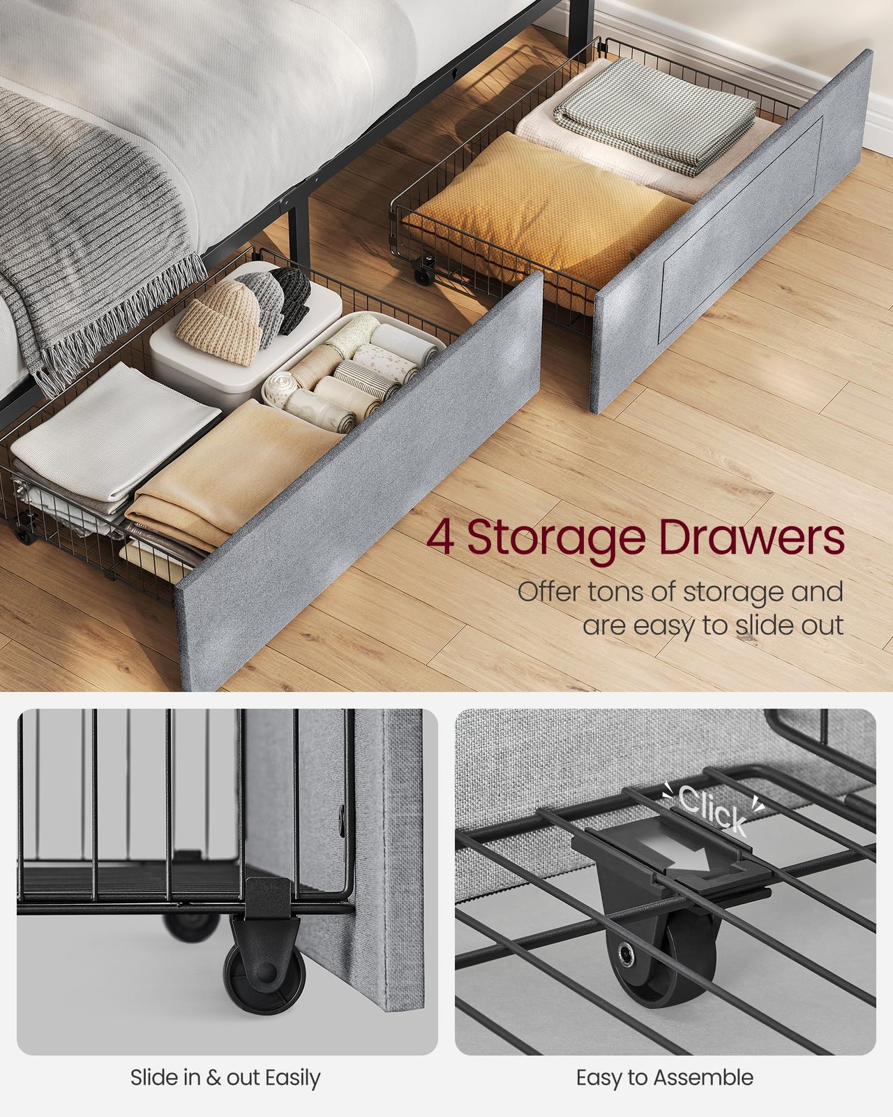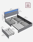[Color and Mode-Adjustable Lights] The lights built into the headboard boast 25 colors, 6 levels of brightness, 3 flashing modes, and 10 blink rates. You can use the remote control to adjust the color and mode to create different atmospheres [2 Charging Ports] The headboard of this bed frame comes with 1 USB port and 1 port to allow you to charge 2 devices at once, making binging on a great show or playing video games in bed from charging issues [Varied Storage Space] 4 large drawers, 2 storage bags, and 2 side pockets give you different storage options for various items—drawers for your off-season clothes, bags for your or reads, and pockets for eyeglasses and other small items [Stable and Sturdy] Supported by sturdy steel slats, this robust bed frame supports up to 1000 lb and is more stable and durable than bed frames supported by wooden slats, letting you rest easy [Easy Assembly & Height Adjustable Headboard] assembly tools, numbered parts, and illustrated, clear instructions help you set up this bed frame easily; the headboard can be adjusted to 36.7" or 39.3" high to fit 6-12 inch mattresses