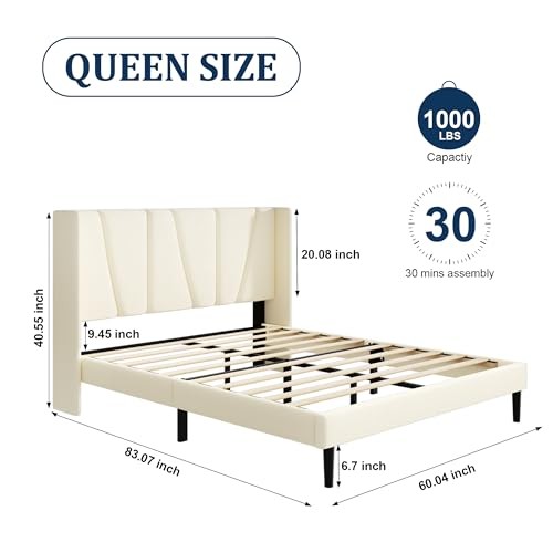 Return Policy Fast Delivery Trusted seller Queen Bed Frame with Headboard and Wingback, Velvet Upholstered Platform Bed, Mattress Foundation with Wooden Slat Support, No Box Spring Needed, Easy Assembly, Noise Free, Beige Product Description MODERN WINGBACK HEADBOARD: This queen size bed frame comes with an upholstered headboard and wingboard, velvet fabric wrapped in soft foam, which not only provides you with a cozy touch, but also adds a sophisticated and elegant visual feeling to the entire bedroom.(Recommended with 8-12" mattresses) STRONG AND DURABLE: The overall frame of this platform bed is made of metal iron frame, and the center support bar adopts cross design plus 10 wooden slats to support the mattress, which ensures the firmness and stability of the bed frame, load bearing capacity: 1000 lbs. NOISE-FREE DESIGN: The bed frame queen size slats are secured with Velcro and can be directly paired with a latex mattress, memory foam mattress, or innerspring mattress without the need for a box spring, simplifying the assembly process while minimizing noise. (Mattress not included with this bed frame) UNDER BED STORAGE SPACE: The bottom of the bed frame is 6.7” high, which is easy to clean under the bed, and you can also store suitcases, storage boxes and other unused items under the bed, saving space in the bedroom EASY TO ASSEMBLE: Enjoy the perfect combination of efficiency and convenience. All components of the bed frame and the required installation tools are packaged together, and all parts are clearly labeled, the package comes with installation instructions, adults can be completed in less than an hour Shipping Returns Payment Shipping Shipping is FREE to all addresses other than APO/PO boxes in the lower 48 states. All our stock ships from US-based warehouses. Shipped via USPS or UPS (depending on location and package weight) Unless stated otherwise, all orders will ship within 24-72 hours of your payment being processed. Check our feedback to see the great reviews of FAST shipping we offer. Returns Seller does not accept returns Payment We currently accept payment via eBay managed payments only. Once payment is cleared, we will dispatch your shipment within 1-3 business days. Please refer to the "Shipping" tab for more information regarding shipping speed to your destination.
